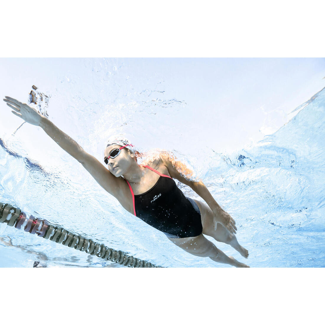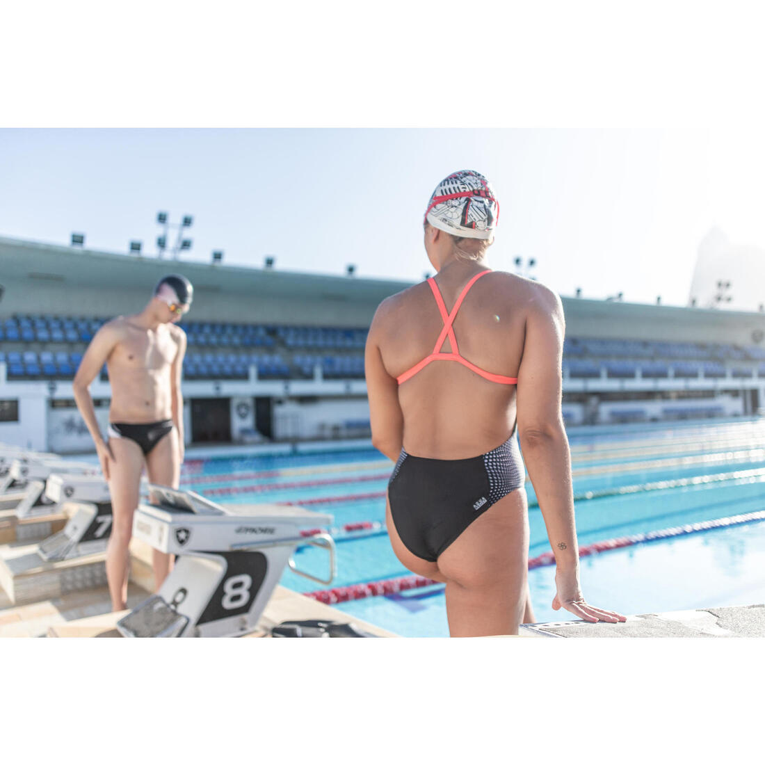 La nageuse sur fond blanc mesure 1m73 et porte une taille 38. Veuillez vous référer au guide des tailles pour connaître votre taillant suivant vos mensurations tour de poitrine, hanche et taille.