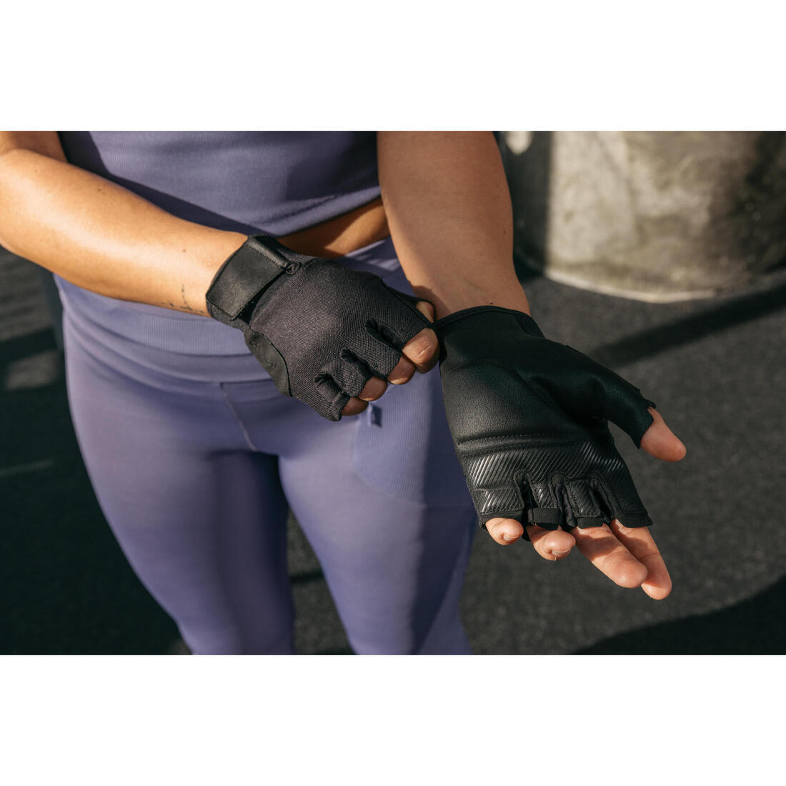 Les gants de musculation 500 noirs permettent : - d'avoir un meilleur grip malgré la transpiration - d'avoir plus de ""confort"" grâce à la matière en suédine rembourrée au niveau de la paume de la main, - d'éviter la magnésie qui peut assécher les mains, - d'échapper à toucher le matériel après tout le monde, - de se préserver des ampoules et de la formation de corne.