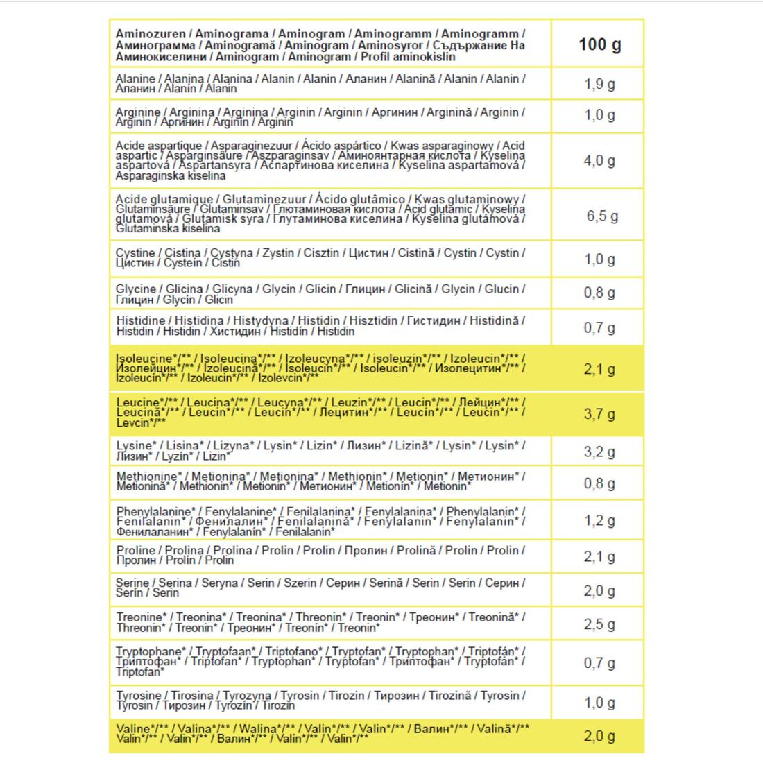 Tableau nutritionnel : 100 g Energie: 372 kcal / 1575 kJ Matières grasses: 3,6 g dont acides gras saturés: 1,4 g Glucides: 50 g dont sucres: 15 g Protéines: 33 g Sel: 0,27 g