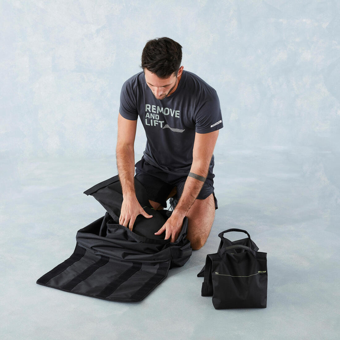 Ce sac lesté est composé d'un grand sac qui peut accueillir un maximum de 4 pochettes à remplir au préalable avec du sable. - 2 pochettes de 5 kg (utilisables séparément) - 1 pochettes de 10 kg - 1 pochette de 15 kg Ce sac lesté est modulable de 10 kg à 35 kg en fonction du type de pochette utilisée. Il est possible de travailler avec une charge de 5 kg en utilisant les pochettes de 5kg de manière indépendante et en dehors du sac.