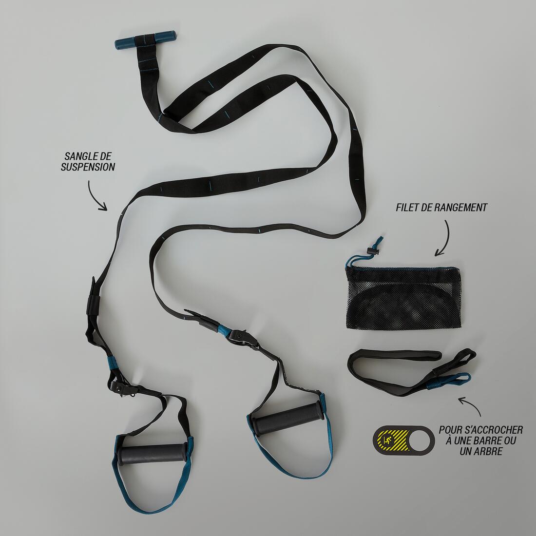 Pour profiter au maximum de votre sangle de suspension, vous pouvez utiliser des accessoires, Voici nos suggestions : - Un tapis (qui peut aller en extérieur et en intérieur) pour les exercices où vous posez les mains ou les genoux au sol (pompes, planche,,,) - Des poignées pour pompes (réf : 8556754) - Un gilet lesté 0 à 5kg (réf : 8736051) ou 6 à 10kg (réf : 8734579)