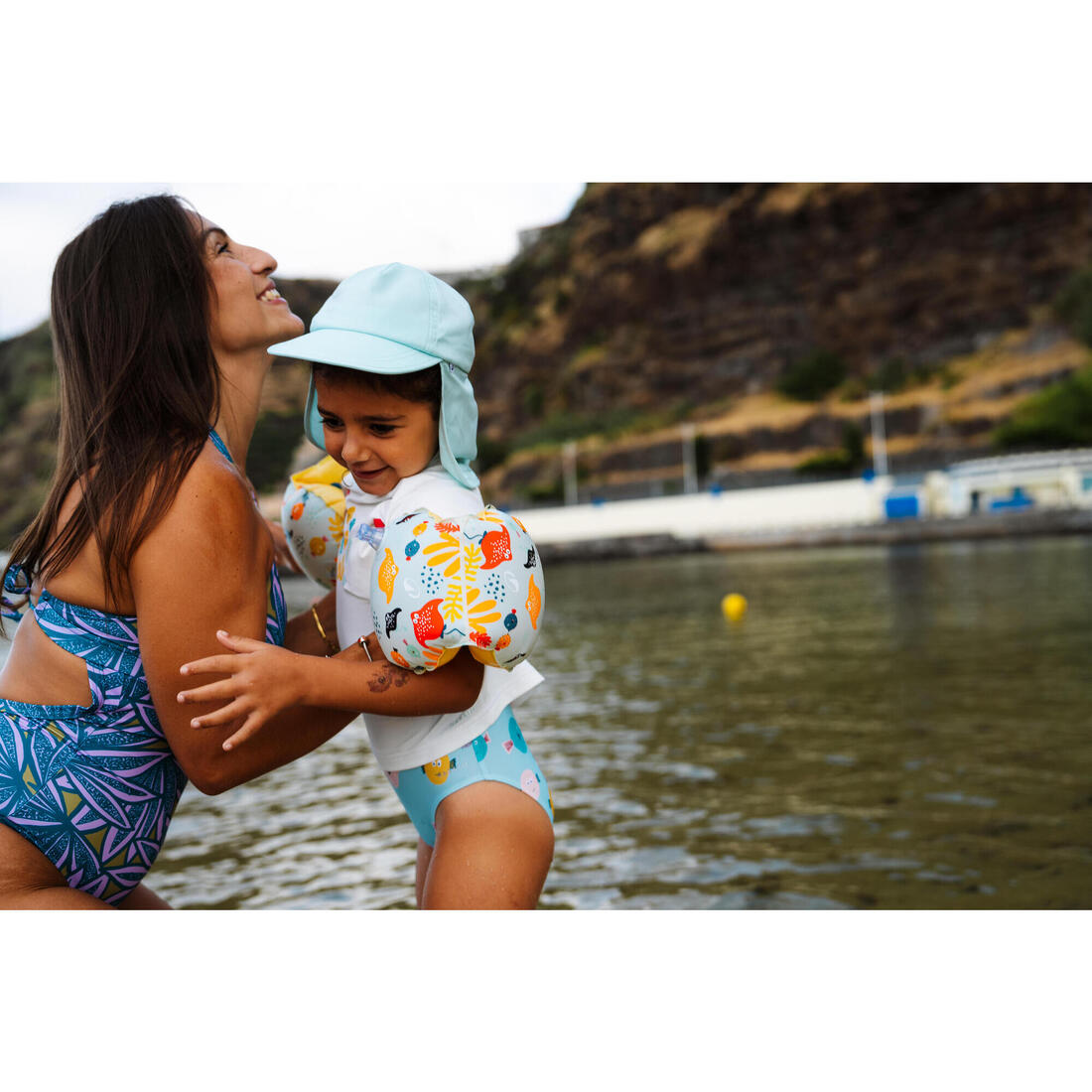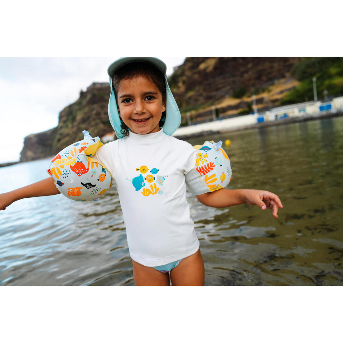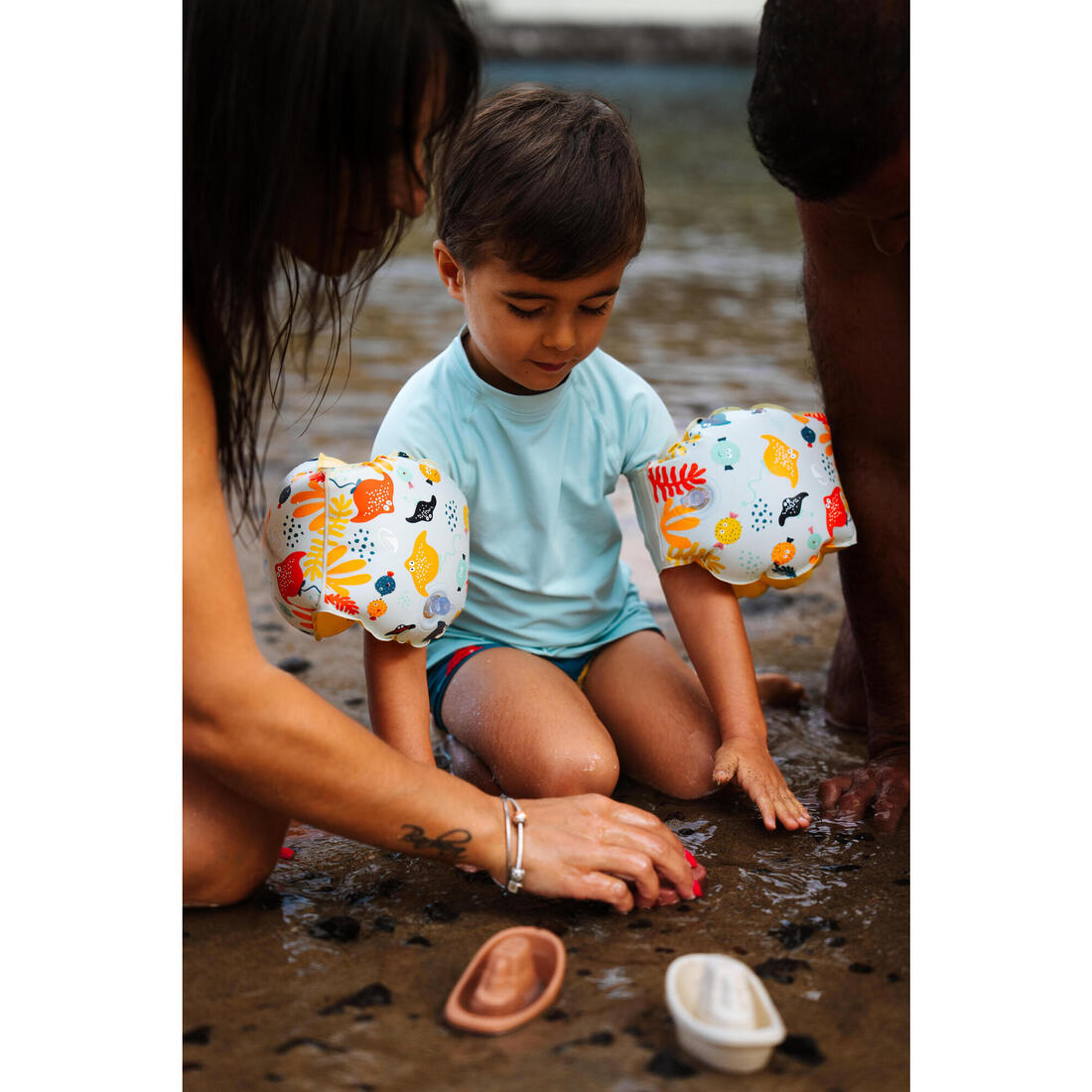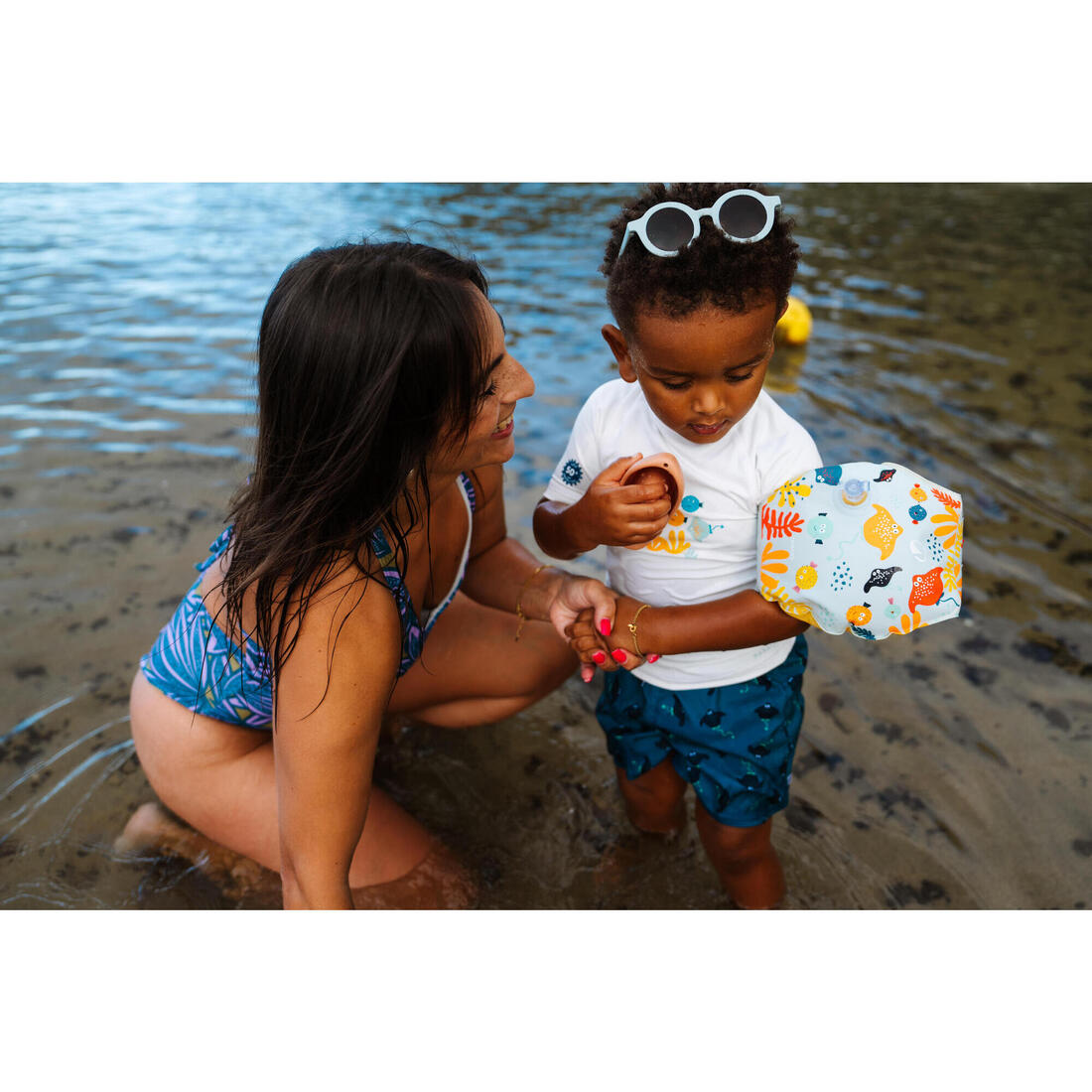 DECATHLON propose 3 expériences d'Eveil Aquatique : Découvrir l'eau, Découvrir la nage et Découvrir l'immersion. Des produits adaptés sont proposés pour chaque expérience. Les Brassards s'inscrivent dans l'expérience « Découvrir l’eau » . Une très bonne flottabilité au niveau des bras permet à l'enfant de garder sa tête hors de l'eau et de prendre confiance progressivement durant sa découverte aquatique. Il se déplace dans l'eau en position plutôt verticale à l'aide des mouvements des jambes.