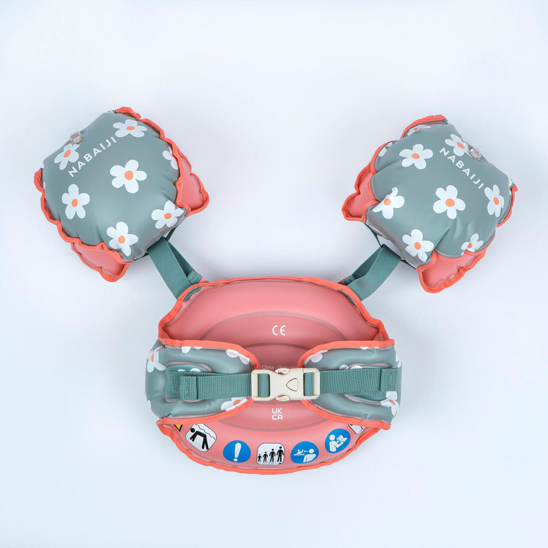 Quand le produit est utilisé au complet. Gonflez la chambre ventrale et positionnez la au niveau de la poitrine de l'enfant. Serrez normalement la sangle à l'arrière. En usage, vérifiez que la chambre ventrale ne remonte pas au niveau du menton pour éviter les frottements. Si besoin, n'hésitez pas à bien repositionner le produit sur le torse de l'enfant.