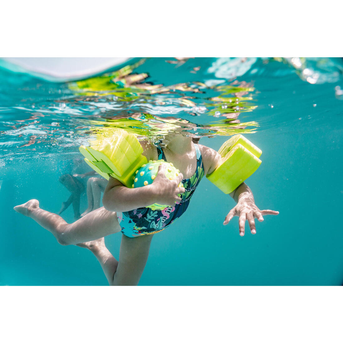 Nabaiji propose 3 expériences dans l'Eveil Aquatique : Découvrir l'eau, Découvrir la nage et Découvrir l'immersion Des produits adaptés sont proposés pour chaque expérience. Les Brassards piscine en mousse s'inscrivent dans « Découvrir l’eau »: l’enfant découvre le milieu aquatique, il a besoin de beaucoup de flottabilité pour l’aider à prendre confiance dans ce nouveau milieu. Ces brassards apportent une stabilité en usage et une flottabilité moins forte que les gonflables mais suffisante