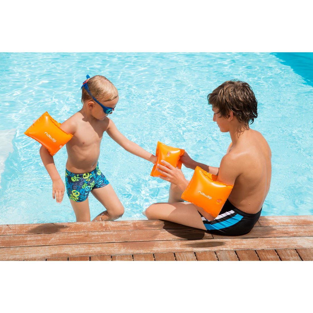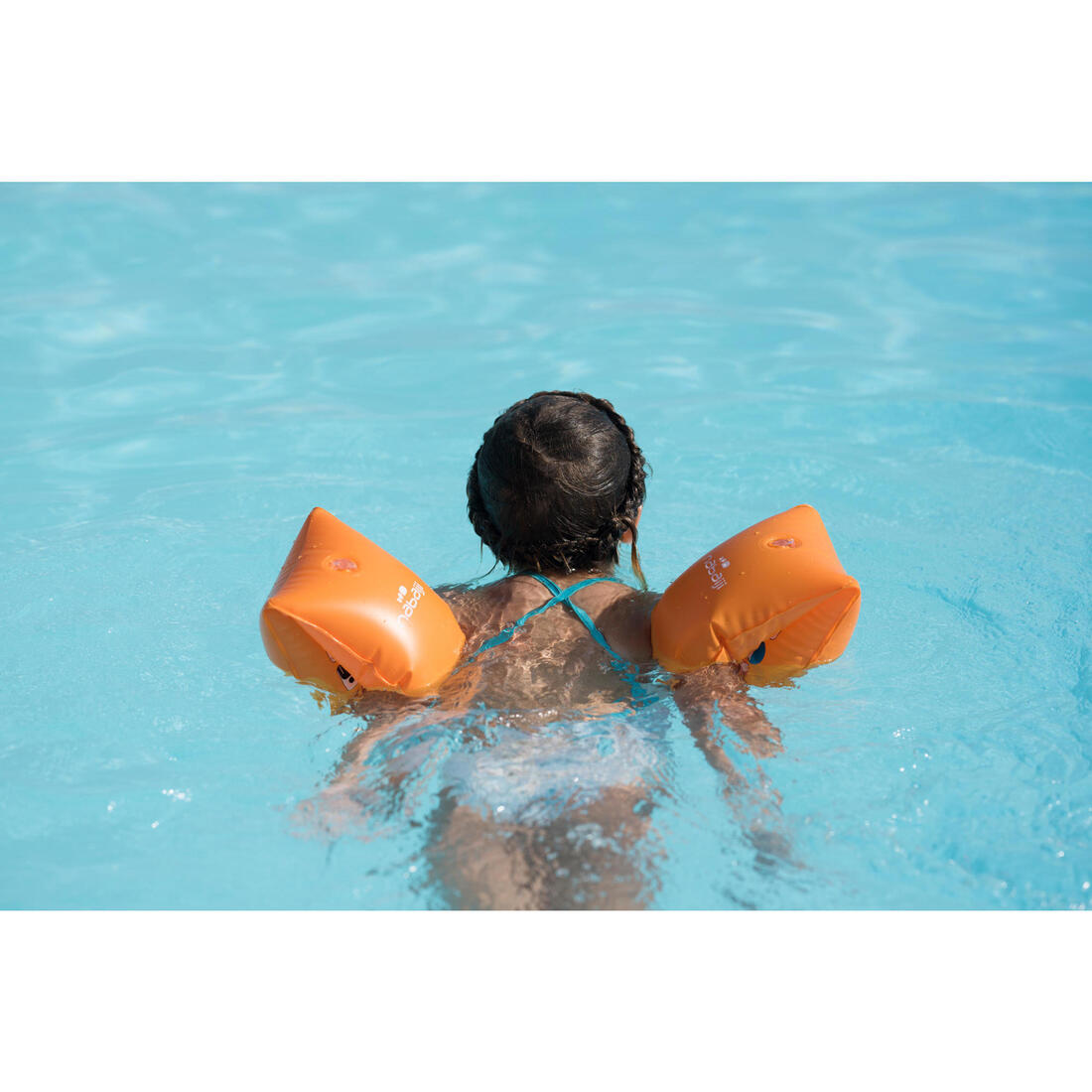 Brassards piscine gonflables composés de deux chambres de gonflage et munis de valves avec clapets anti-retour. Idéal pour la découverte aquatique des enfants sous surveillance constante d'un adulte.