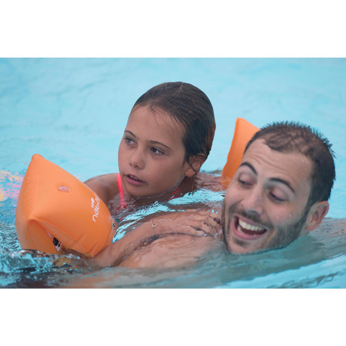 Brassards piscine gonflables composés de deux chambres de gonflage et munis de valves avec clapets anti-retour. Idéal pour la découverte aquatique des enfants sous surveillance constante d'un adulte.