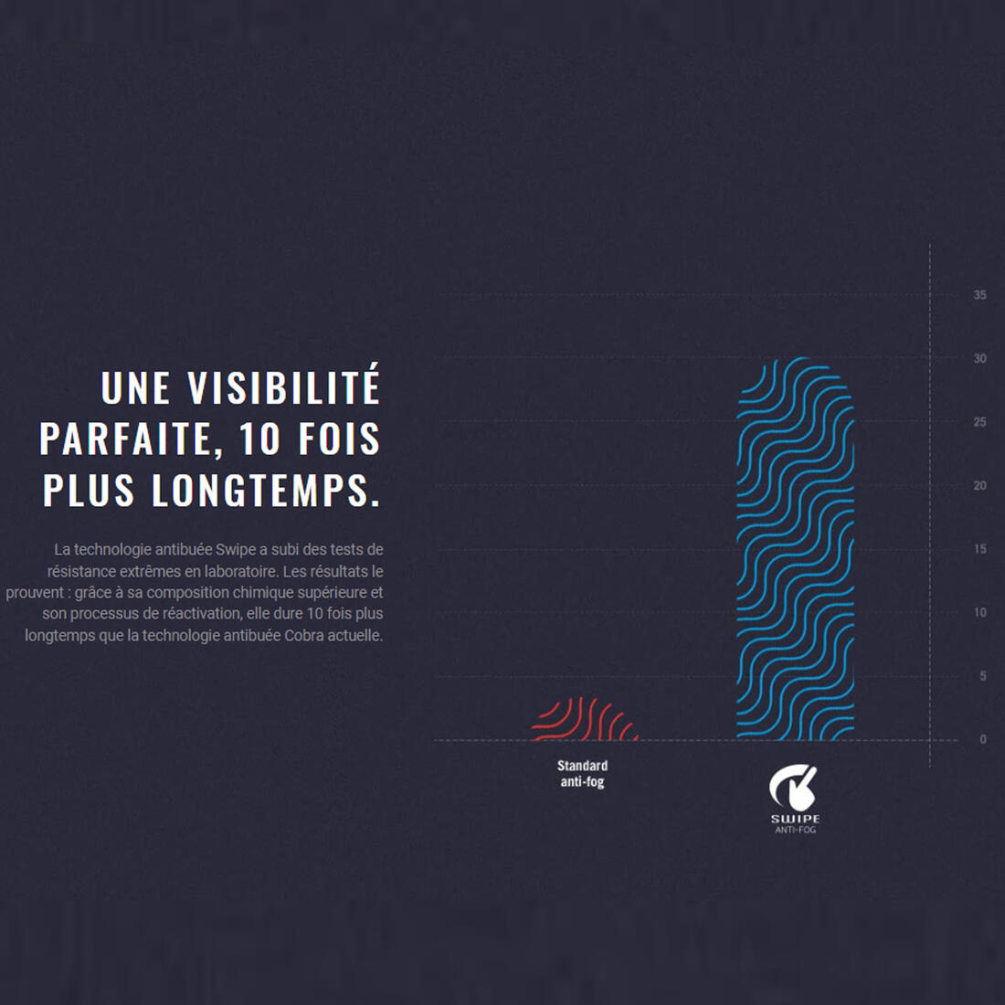Grâce à la révolutionnaire technologie antibuée Swipe, l'antibuée sur les nouvelles lunettes Cobra Ultra Swipe peut être réactivé par un simple passage du doigt, prolongeant la protection jusqu'à 10 fois plus longtemps. L'antibuée Swipe se réactive et se rétablit chaque fois que les verres sont nettoyés avec le doigt. La technologie antibuée Swipe a subi des tests de résistance extrêmes en laboratoire : elle dure 10 fois plus longtemps que la technologie antibuée Cobra actuelle.