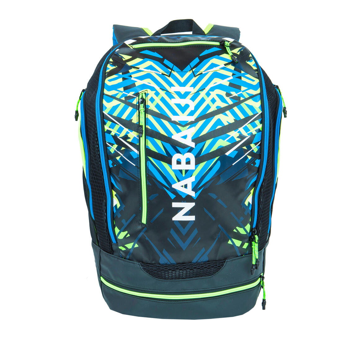 5 COMPARTIMENTS : - 2 latérales (gel douche / lunettes) - 2 principales (palmes / textile dont une poche étanche) - 1 ventrale (sandales / tongs)