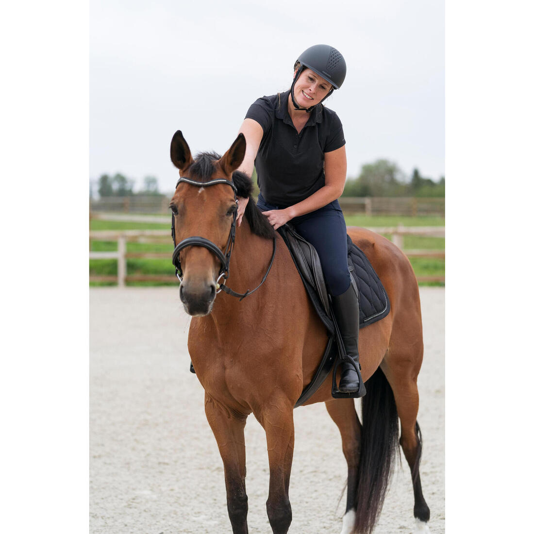 Vous recherchez un polo confortable ? Grâce à son tissu extensible et doux, notre polo 100 vous suivra lors de vos séances à cheval. Sa coupe plus longue dans le dos vous apporte une bonne couvrance.