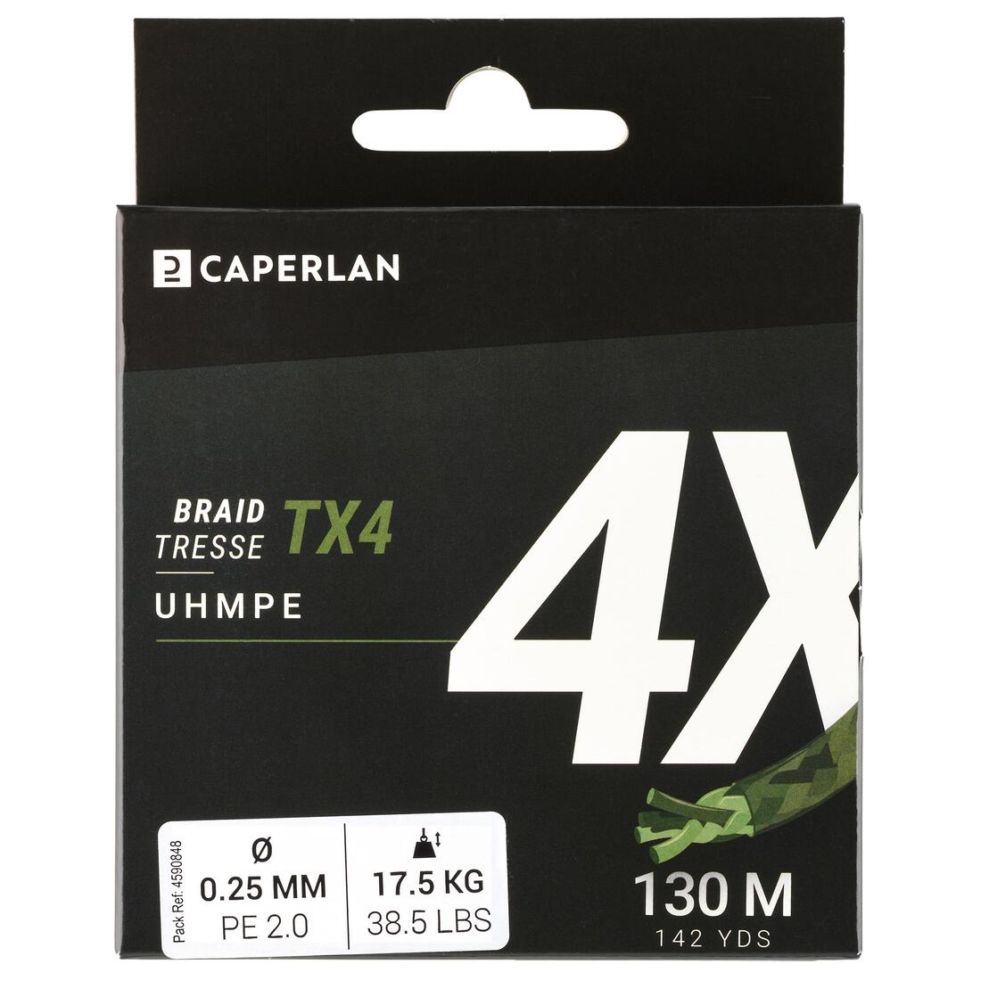 Bobine de 130 mètres Ø : 12/100 - 5.9 kg - 13 Lbs Ø : 16/100 - 9.3 kg - 20.6 Lbs Ø : 18/100 - 11.2 kg - 24.7 Lbs Ø : 20/100 - 15 kg - 33.1 Lbs Ø : 25/100 - 17.5 kg - 38.5 Lbs Ø : 30/100 - 23 kg - 50.7 Lbs Ø : 35/100 - 26 kg - 57.3 Lbs Cette tresse est également disponible en couleur KAKI en conditionnement de 300 mètres (dans certains diamètres) et en 130 mètres en VERT CHARTREUX. Référence 8677252 TX4 300M KAKI Référence 8677251 TX4 130M VERT CHART