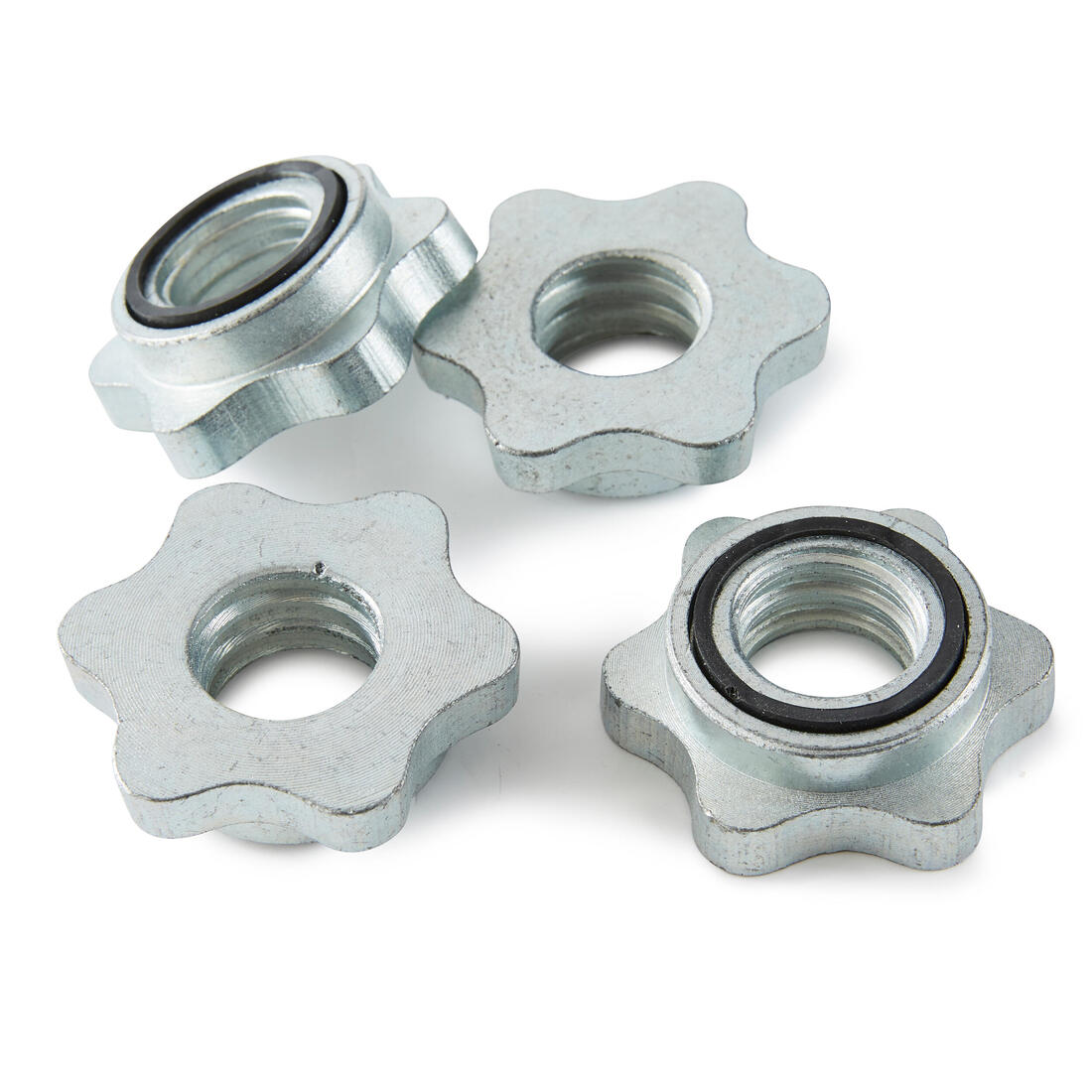 Les poids se fixent sur la barre filetée à l'aide de l'écrou. Cela permet de sécuriser les poids y compris lorsque vous utilisez les haltères en vertical. Si vous réalisez des entraînements dynamiques il faudra vérifier le serrage des écrous entre 2 séries, si vous entendez les disques s'entrechoquer. Cela dit, un petit peu de jeu est normal pour garder la facilité d'enfilage sur la barre.