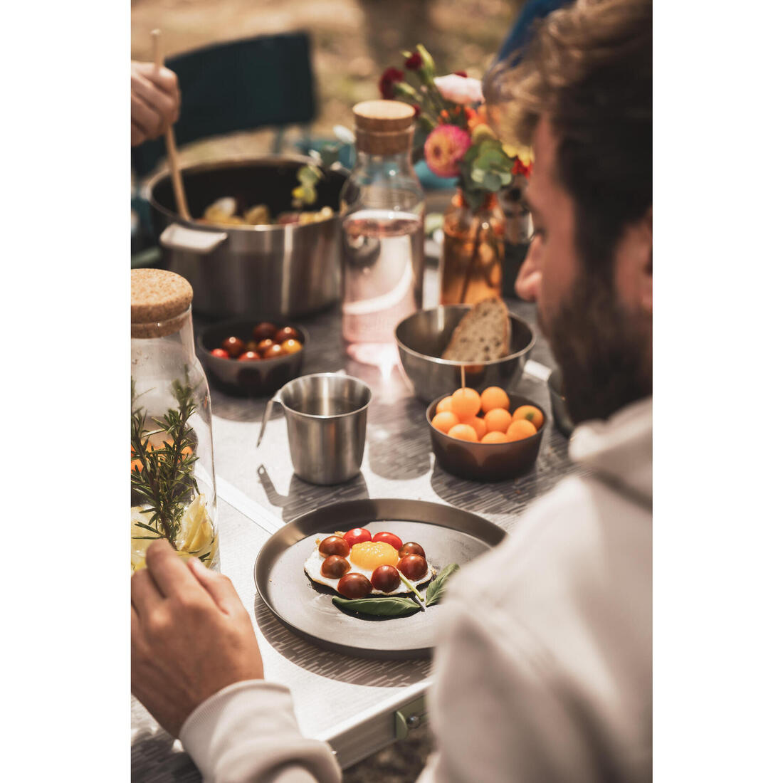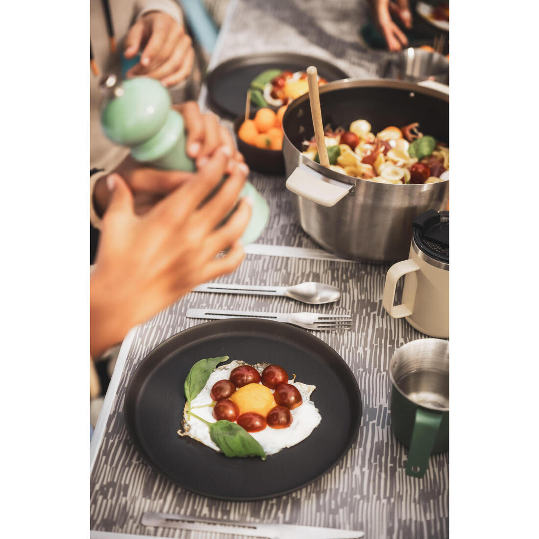 Régalez-vous du petit-déjeuner au diner. Notre popote contient tout ce qu'il faut pour 4 personnes : - 4 assiettes plates au format XL - 4 bols ; - 4 gobelets/tasses ; - 4 sets de 3 couverts (fourchette, cuillère, couteau) empilables avec housse/pochette de rangement en microfibre.