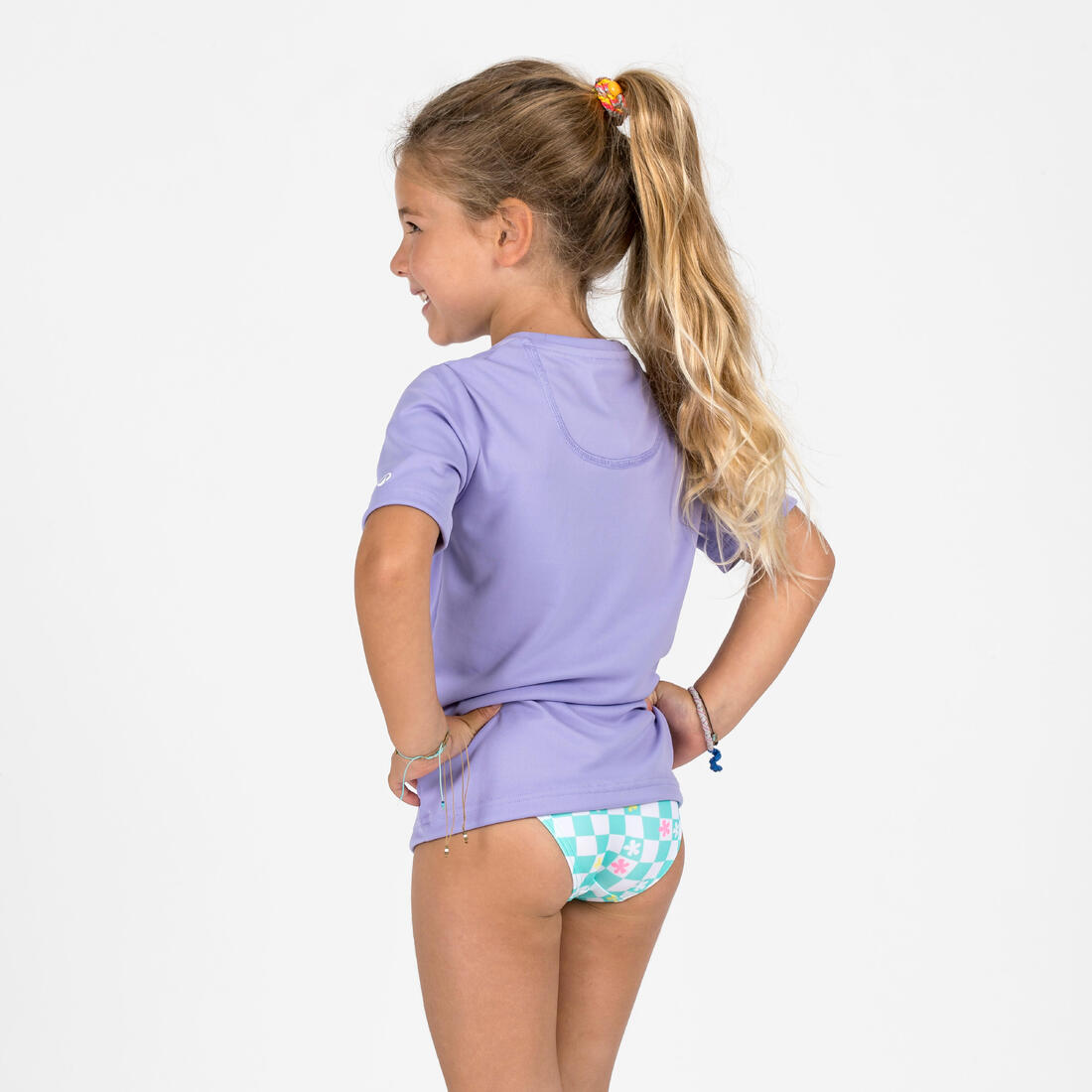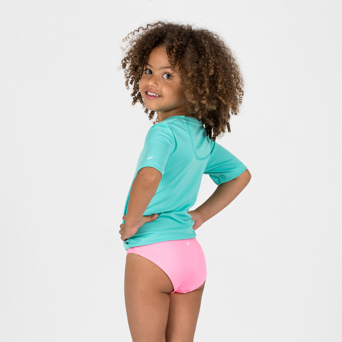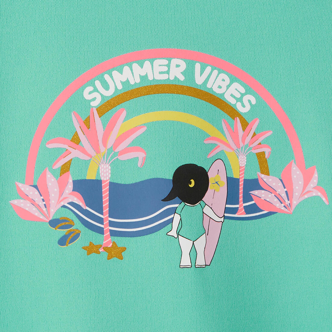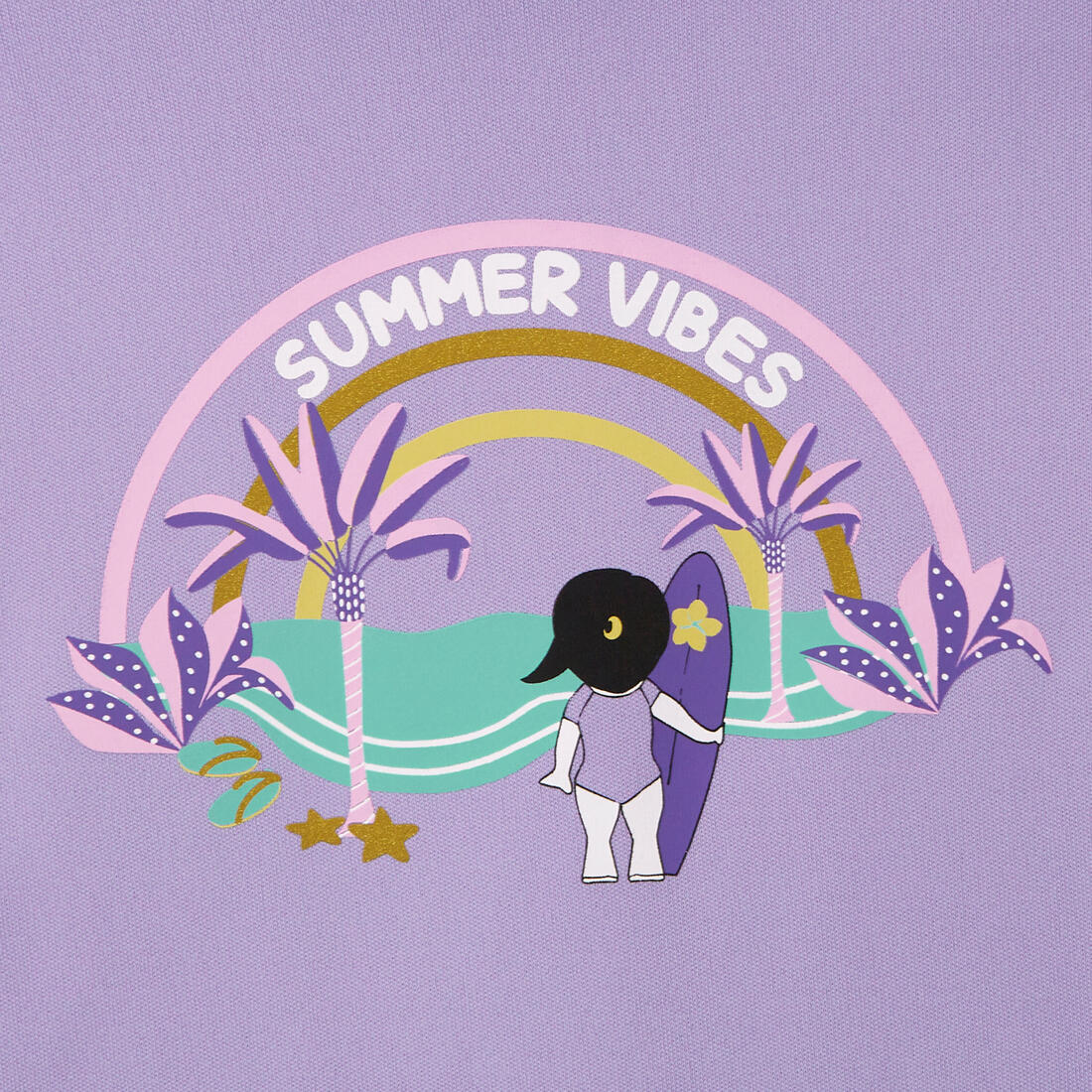 Tee shirt anti-UV enfant manches courtes pour protéger du soleil, même dans l'eau, et limiter les irritations au contact de la planche. Coupe ample pour un enfilage facile.