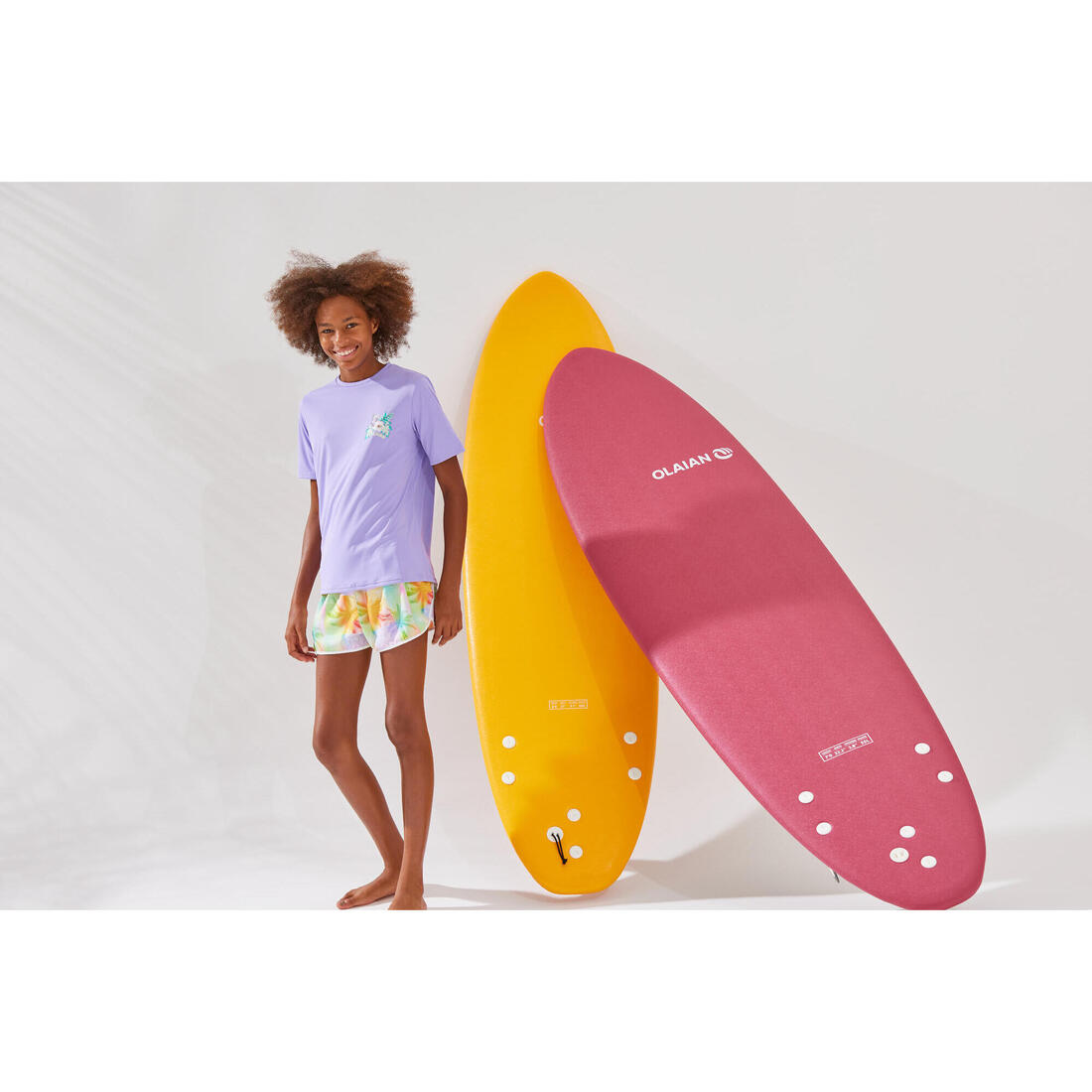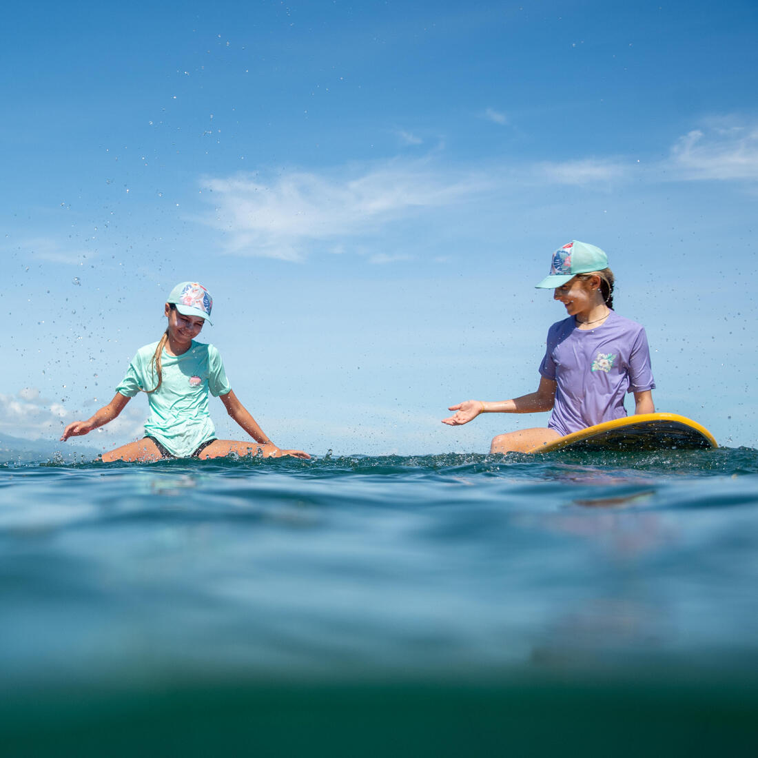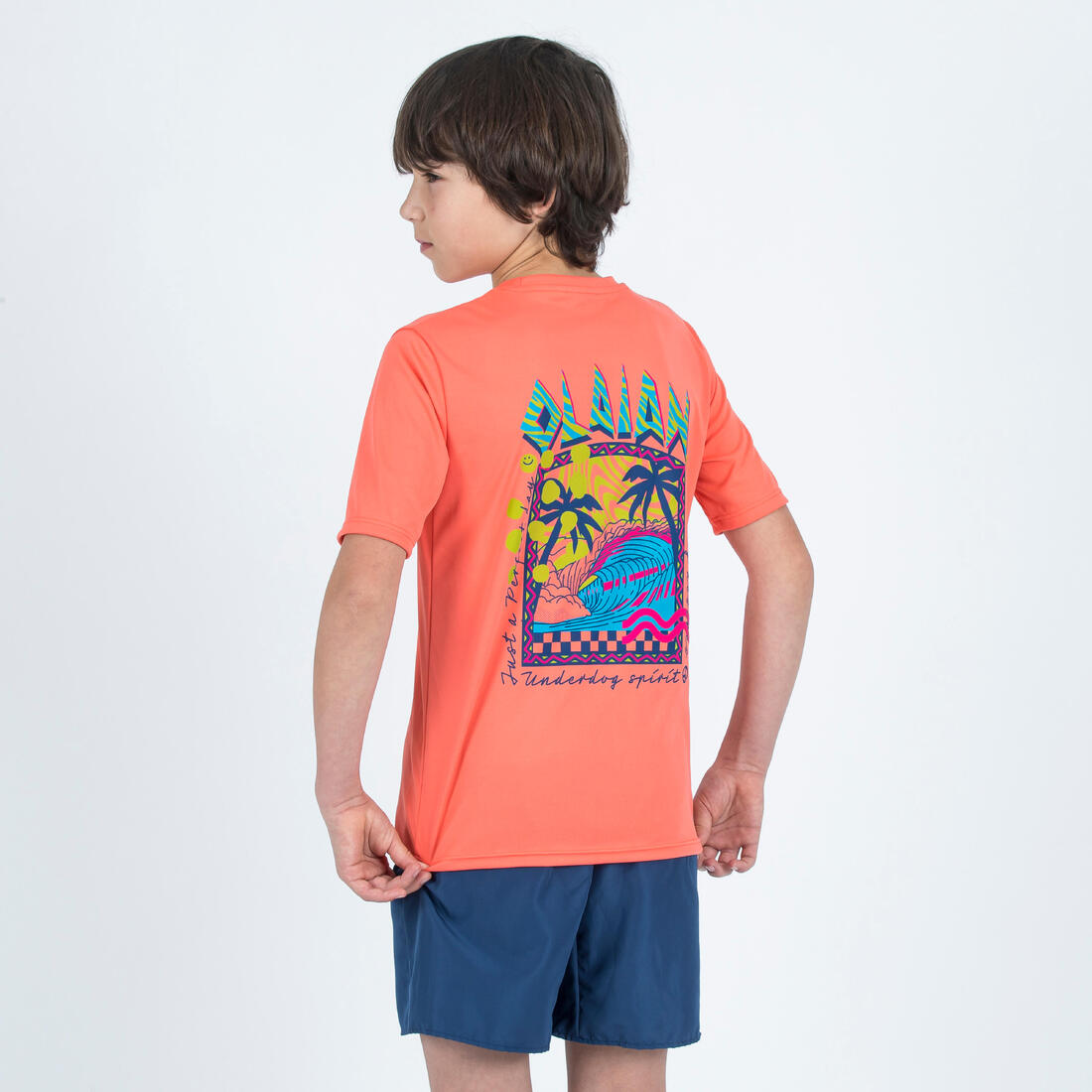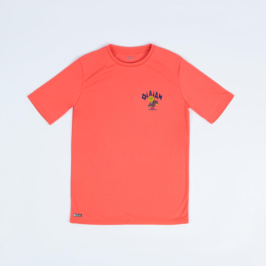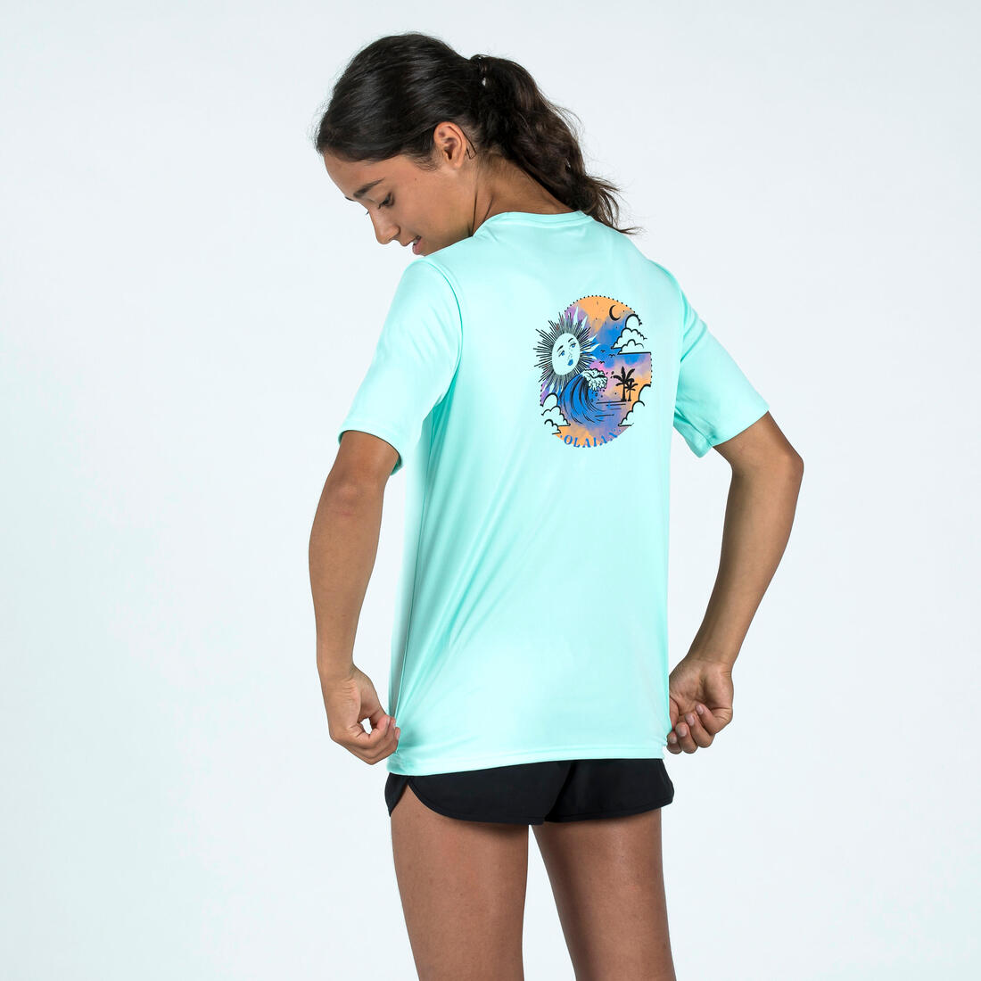 T-shirt anti-UV junior manches courtes pour protéger du soleil, même dans l'eau, et limiter les irritations au contact de la planche. Coupe ample pour un enfilage facile.