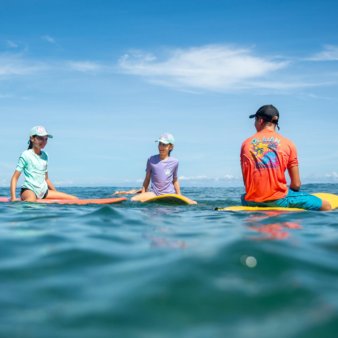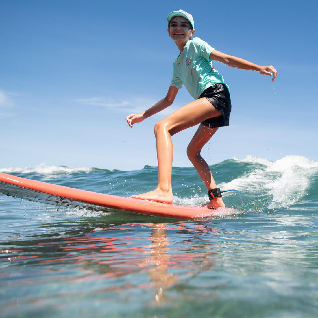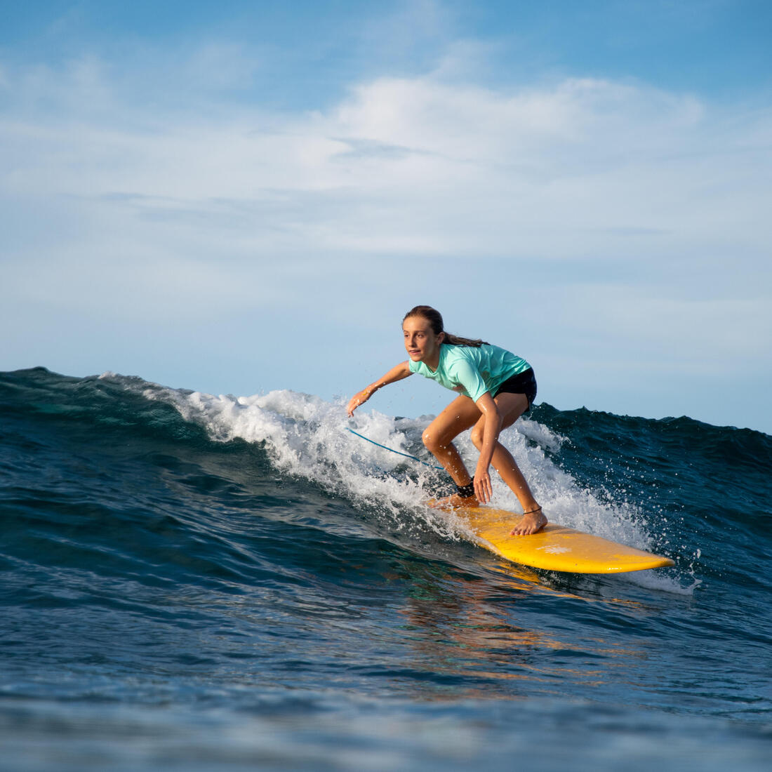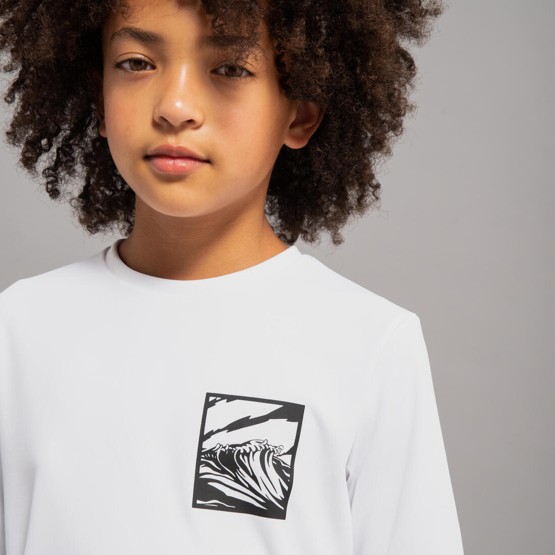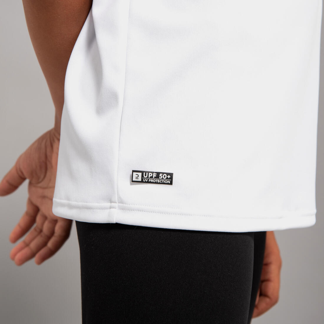 T-shirt anti-UV junior manches courtes pour protéger du soleil, même dans l'eau, et limiter les irritations au contact de la planche. Coupe ample pour un enfilage facile.