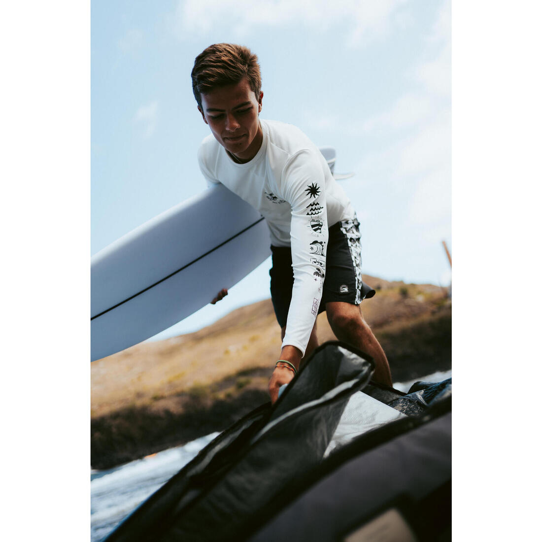 T-shirt anti-UV junior manches longues pour protéger du soleil, même dans l'eau, et limiter les irritations au contact de la planche. Coupe ample pour un enfilage facile.