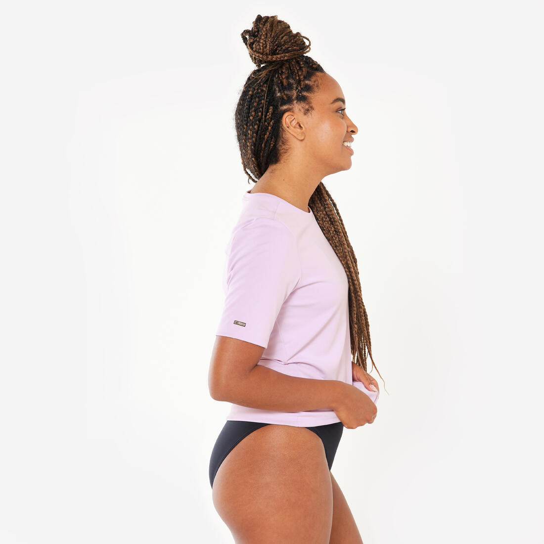 Ce tee shirt anti UV à manches courtes accompagne les surfeuses débutantes dans leurs sessions estivales.