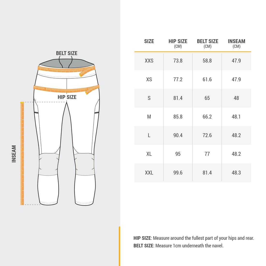 Hanche (in) | 31.5 – 33.5 | 33.9 – 35.2 | 35.6 – 37 | 37.4 – 38.8 | 39.2 – 40.6 | 40.9 – 42.6 | 43 – 44.7 | 45.1 – 46.8 | 47.1 – 48.8 | 49.2 – 51.2 | 51.6 – 53.5 | 53.9 – 55.9 |