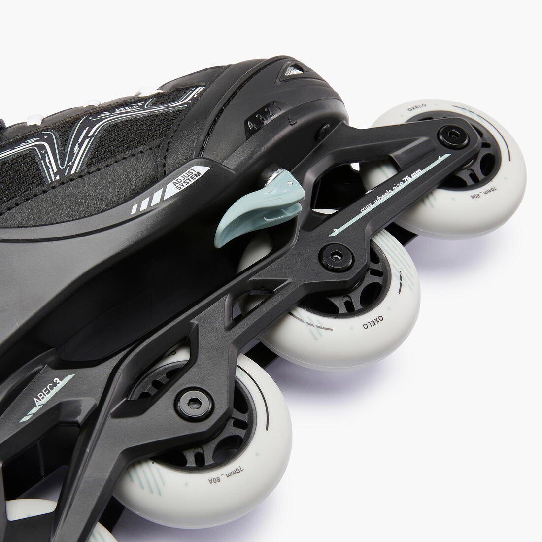 La platine en composite, plus légère, favorise l'apprentissage : elle procure un bon confort de glisse. Les roues de 70 mm 80A et les roulements ABEC 3 offrent un bon compromis entre les sensations de glisse et la maniabilité. Et pour freiner, nos rollers sont équipés d'un frein classique en tampon gomme que vous pouvez installer au pied droit ou gauche. Des tampons de rechange sont disponibles en magasin.