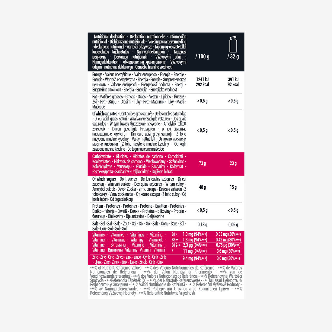 Apporte 92kcal et 23g de glucides (glucose, maltodextrine, fructose) par gel.