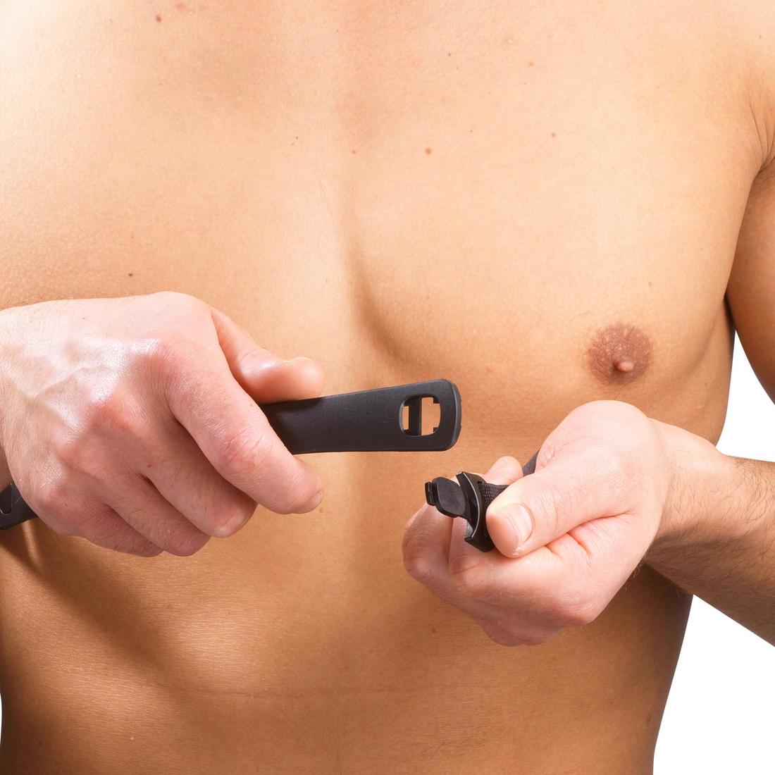 La fréquence cardiaque est mesurée grâce à une ceinture pectorale que vous portez autour de votre buste. Celle-ci est composée de deux électrodes et d'un émetteur. Lorsque votre cœur bat, il émet un très faible champs électrique. Celui-ci est capté par les électrodes puis transmis à votre montre par l'emetteur de la ceinture.