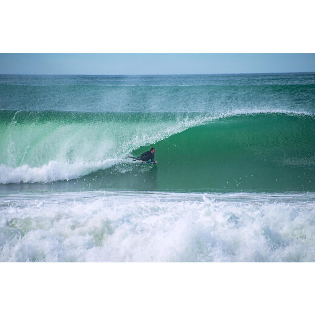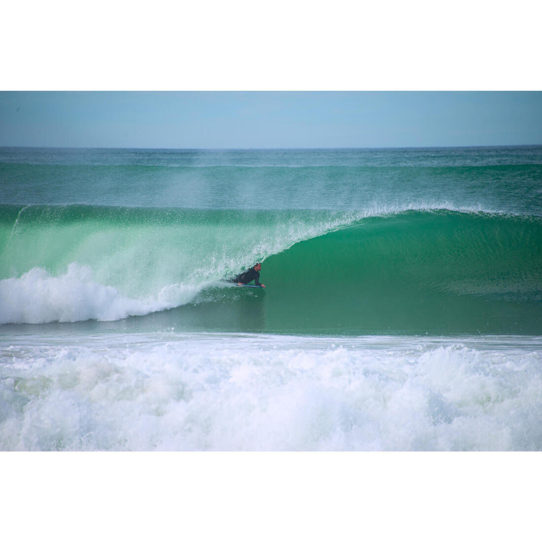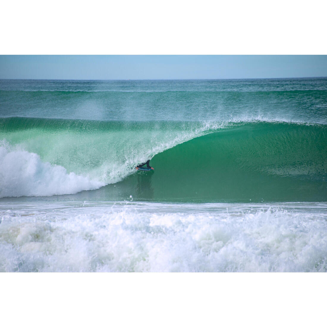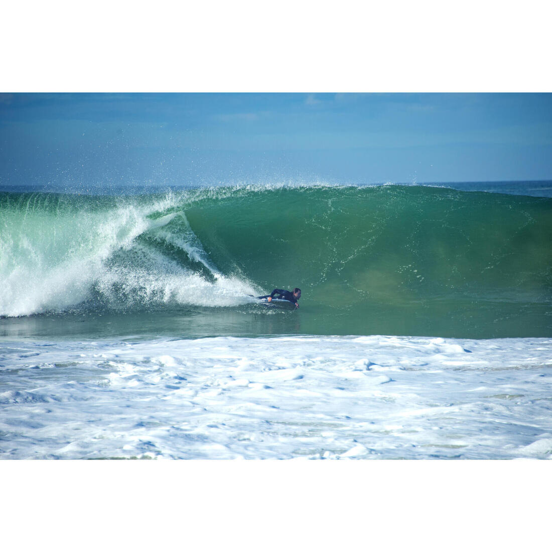 Sur la vague, le bodyboard s'utilise allongé. Il est important de porter un top anti-UV manches longues ou une combinaison suivant la témpérature de l'eau, pour éviter les irritations (douloureuses) sur le ventre et les bras. Pour une bonne adhérence sur le bodyboard, il est recommandé de le waxer sur l'avant de la planche, sur les côtés (rails) et sur le ventre. Wax à adapter à la température, vendue séparément au rayon surf. Renouvelez l'opération à chaque session.