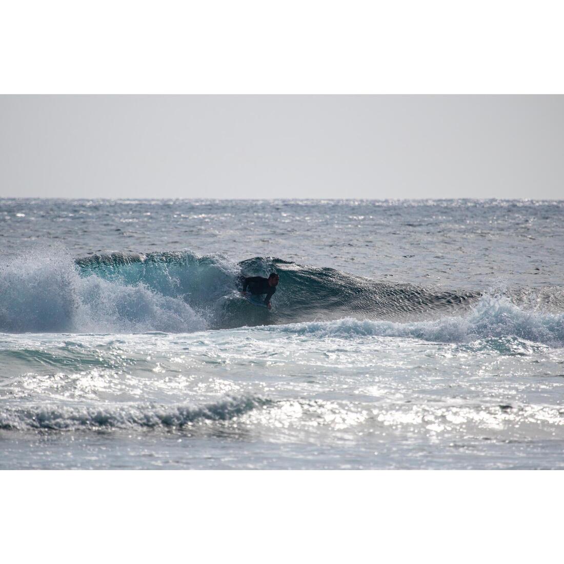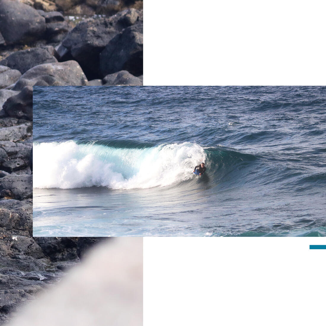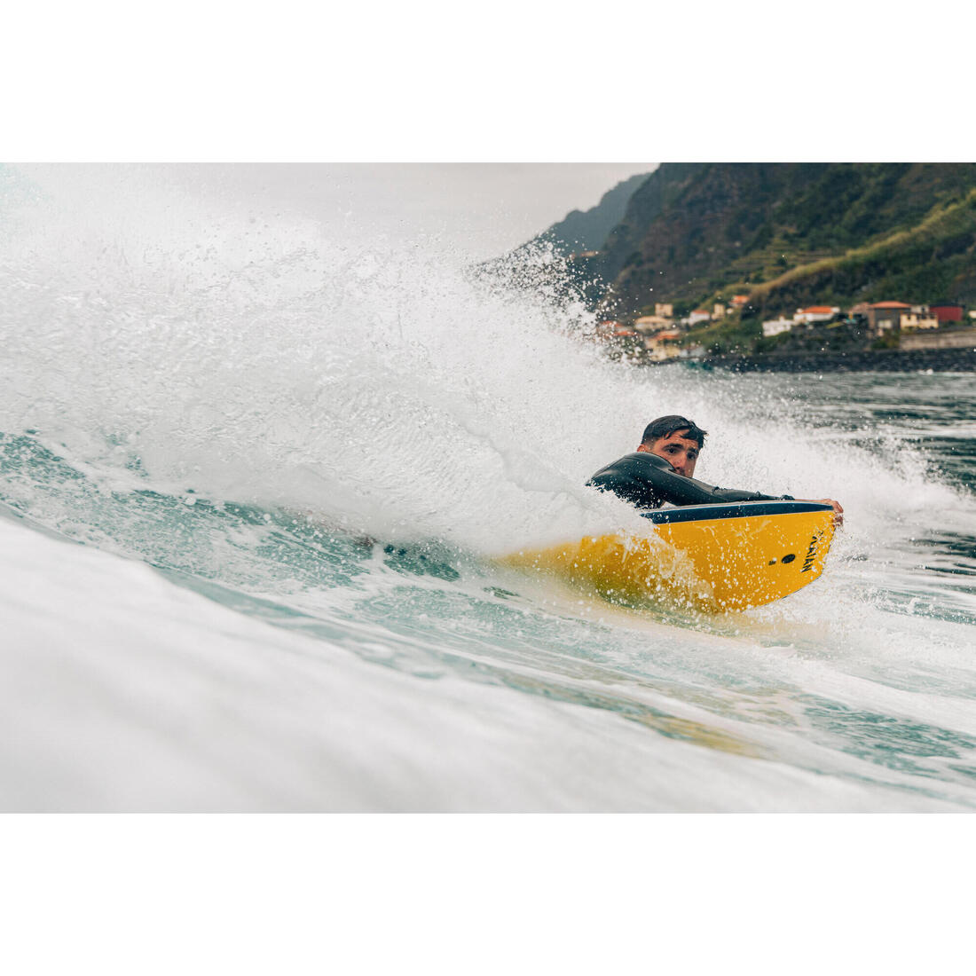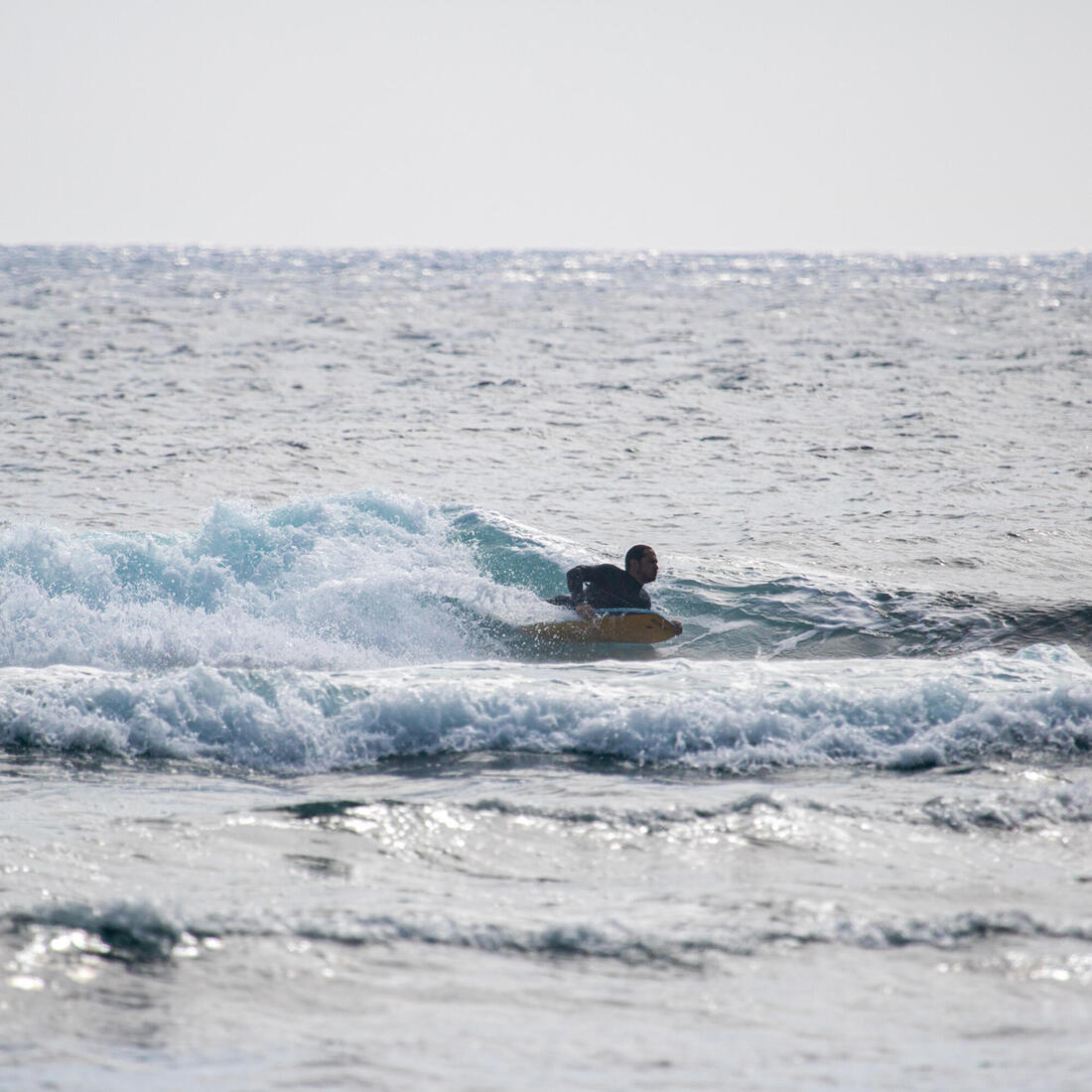 Sur la vague, le bodyboard s'utilise allongé. Il est important de porter un top anti-UV manches longues ou une combinaison suivant la témpérature de l'eau, pour éviter les irritations (douloureuses) sur le ventre et les bras. Pour une bonne adhérence sur le bodyboard, il est recommandé de le waxer sur l'avant de la planche, sur les côtés (rails) et sur le ventre. Wax à adapter à la température, vendue séparément au rayon surf. Renouvelez l'opération à chaque session.