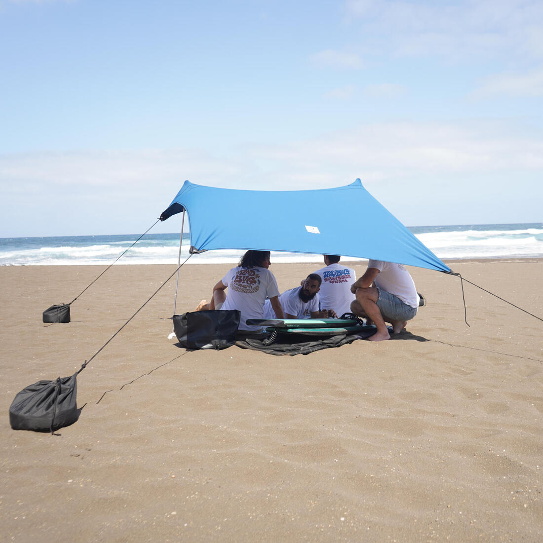 Abris de plage suffisamment grand pour 4 adultes. Se fixe sans sardines grâce à ses 2 mats en aluminium et ses 4 sacs de lestage à remplir de sable pour tendre la structure.