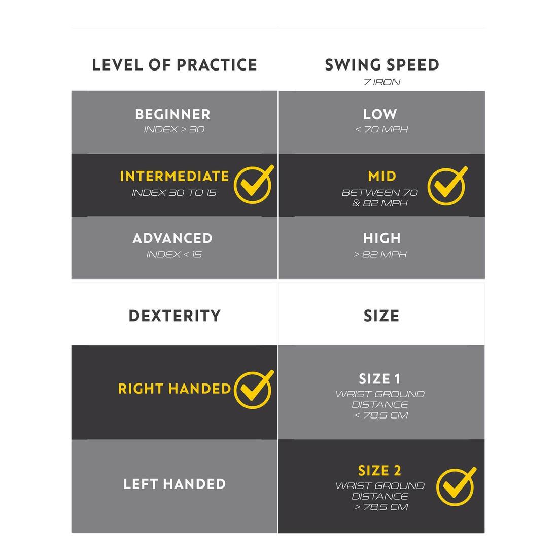 Le grip monté sur les clubs Inesis 500 est adapté à la longueur du club : Grip taille 1 undersize sur les shafts taille 1 Grip taille 2 standard sur les shafts taille 2