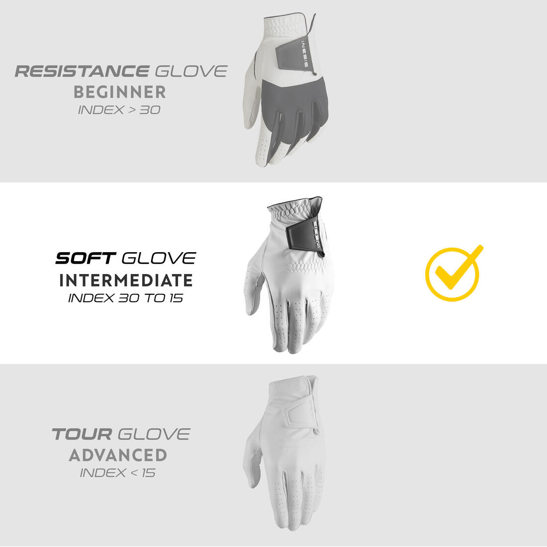 Notre gant Soft, conseillé aux golfeurs confirmés (index compris entre 15 et 30), va vous permettre d'avoir de bonnes sensations de jeu en conservant une grande resistance. Le gant doit etre parfaitement ajusté à votre main.