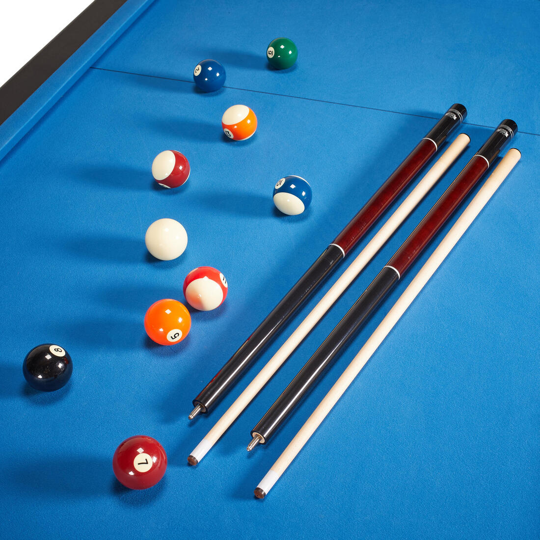 - 4 queues de billard : 2 queues 500 US (145 cm), 1 queue 300 US de 122 cm et une queue 300 US de 145 cm - 1 rallonge avec 1 bridge et 1 croix - 15 billes de billard américain numérotées de 57,2 mm de diamètre (162 g) + 1 bille blanche - 15 billes de billard anglais (rouges et jaunes) de 57,2 mm de diamètre (162 g) + 1 bille blanche - 1 triangle standard et 1 losange pour le jeu de la 9 - 1 porte queues - 4 craies (bleus) et 2 porte-craies - 1 brosse et 1 housse de protection