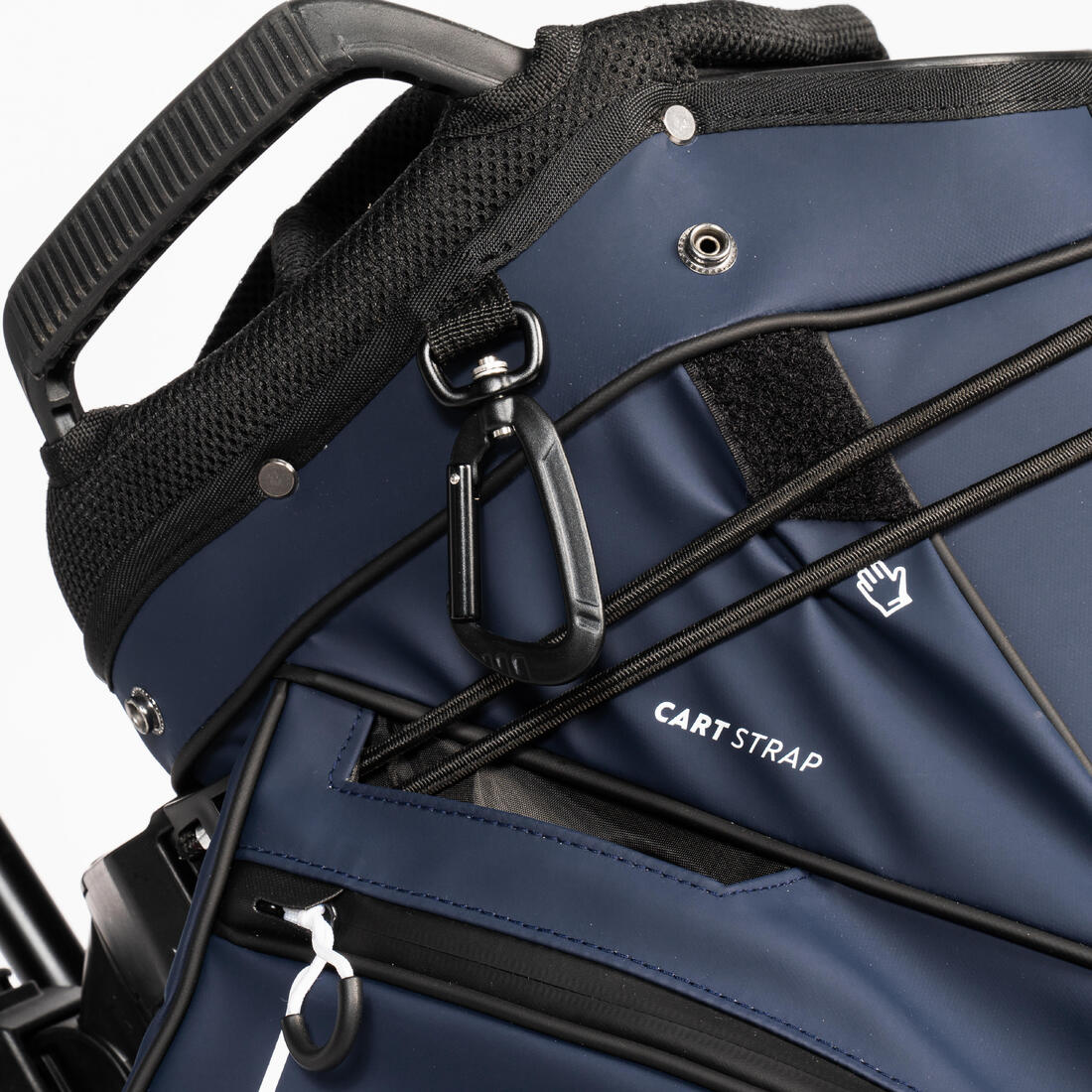 Nous avons conçu ce sac pour transporter votre matériel de golf sur un chariot ou une voiturette de golf grâce à un passage spécifique pour les sangles.