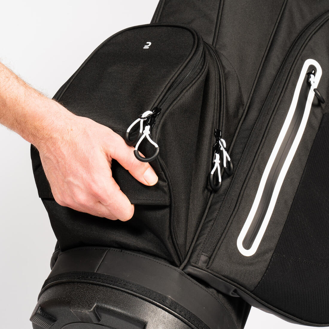 - 2 poches , dont 1 doublée fibre polaire et 1 grande contenance pour vêtements de 15 L - 1 poche côté grande contenance isotherme pour bouteille d'eau, et alimentation de 5 L - 3 Poches accès rapide (objets de valeur, tees et balles ) de 2 L, 4 L et 8 L. - 1 Poche magnétique frontale accès facile (jumelles, télémètre) de 3 L - Poche en tissu aéré, accès facile (bouteille d'eau, accessoires) de 15 L - Compartiment club putter à accès directe - Fourreau pour parapluie - Compartiment stylo