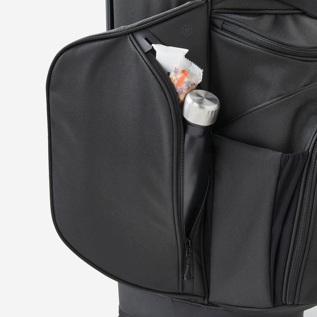 11 poches : - 1 poches étanchée doublée laine polaire. Contenance : 3,5L - 1 poche côté grande contenance pour vêtements, contenance : 12L - 1 poche interne filet pour housse ou vêtement de pluie :1,5L - 2 Poches accès rapide : Contenance : 1L (tees)+7L (balles) - 1 poche interne filet : 1L (gants) - 1 Poche côté filet accès facile. Contenance : 0,5L - 1 poche : Stylo - 1 poche côté isotherme pour nourriture : 4L -1 poche côté pour bouteille : 1,5L - 1 compartiment : porte parapluie