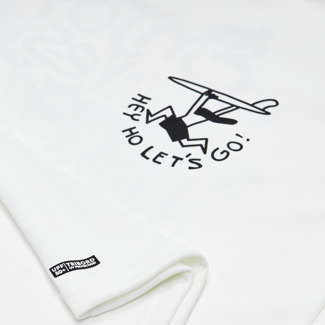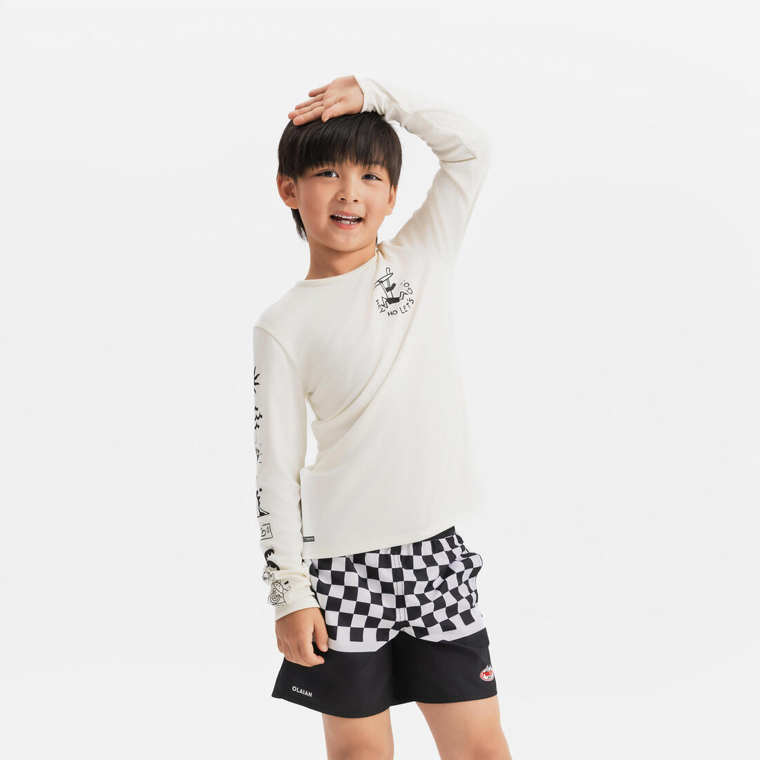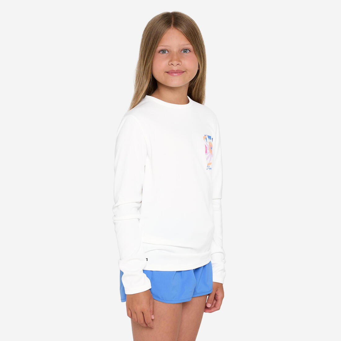 T-shirt anti-UV junior manches longues pour protéger du soleil, même dans l'eau, et limiter les irritations au contact de la planche. Coupe ample pour un enfilage facile.