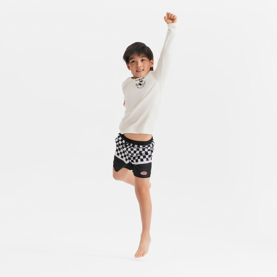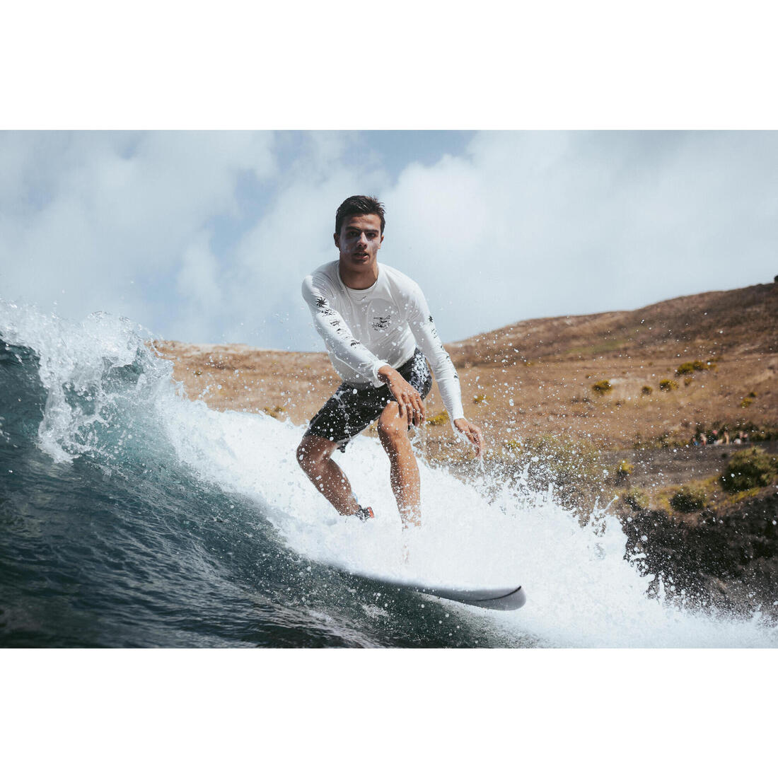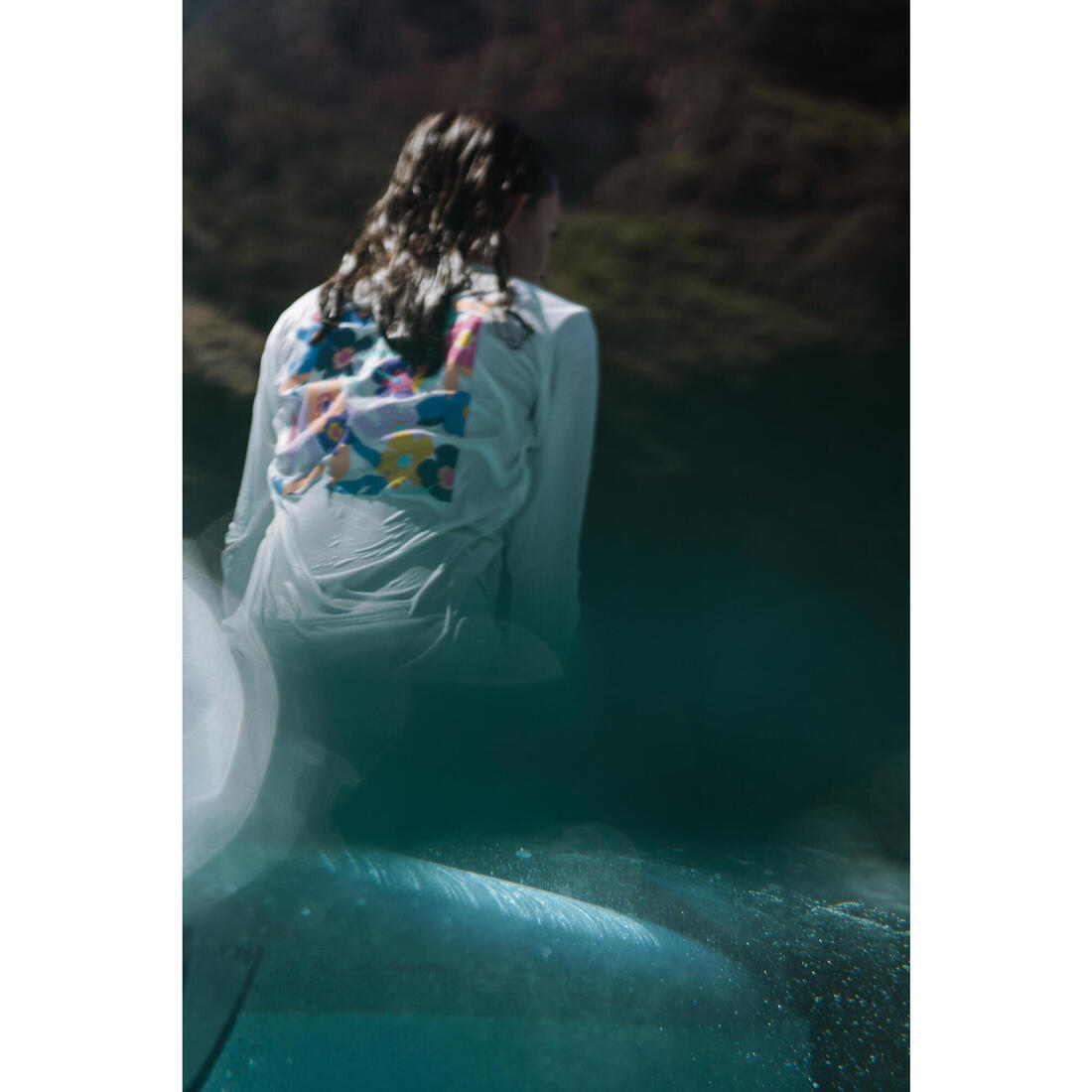 T-shirt anti-UV junior manches longues pour protéger du soleil, même dans l'eau, et limiter les irritations au contact de la planche. Coupe ample pour un enfilage facile.