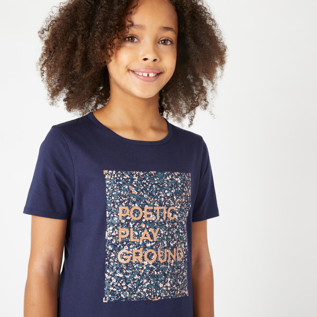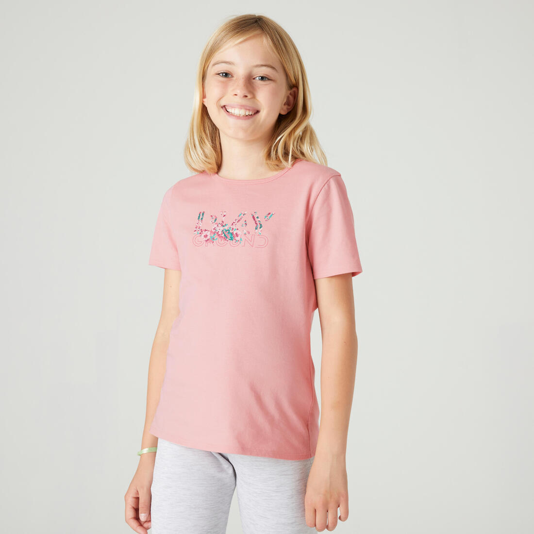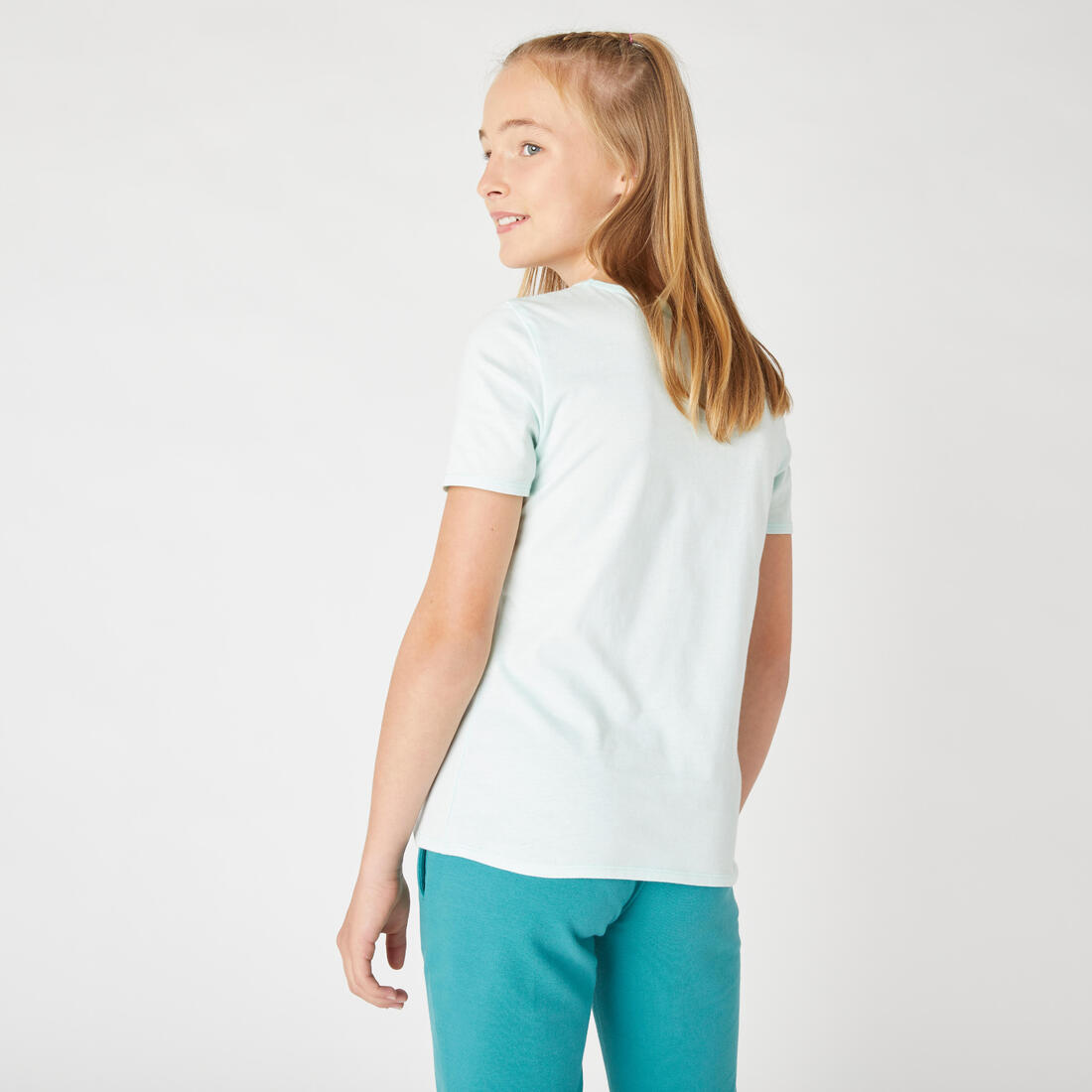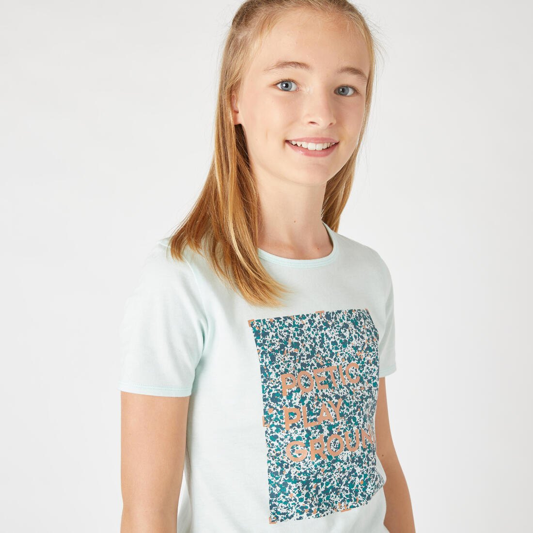 Notre mannequin porte le t-shirt manche courte 100 en taille 10-11 ans, elle mesure 1m43.