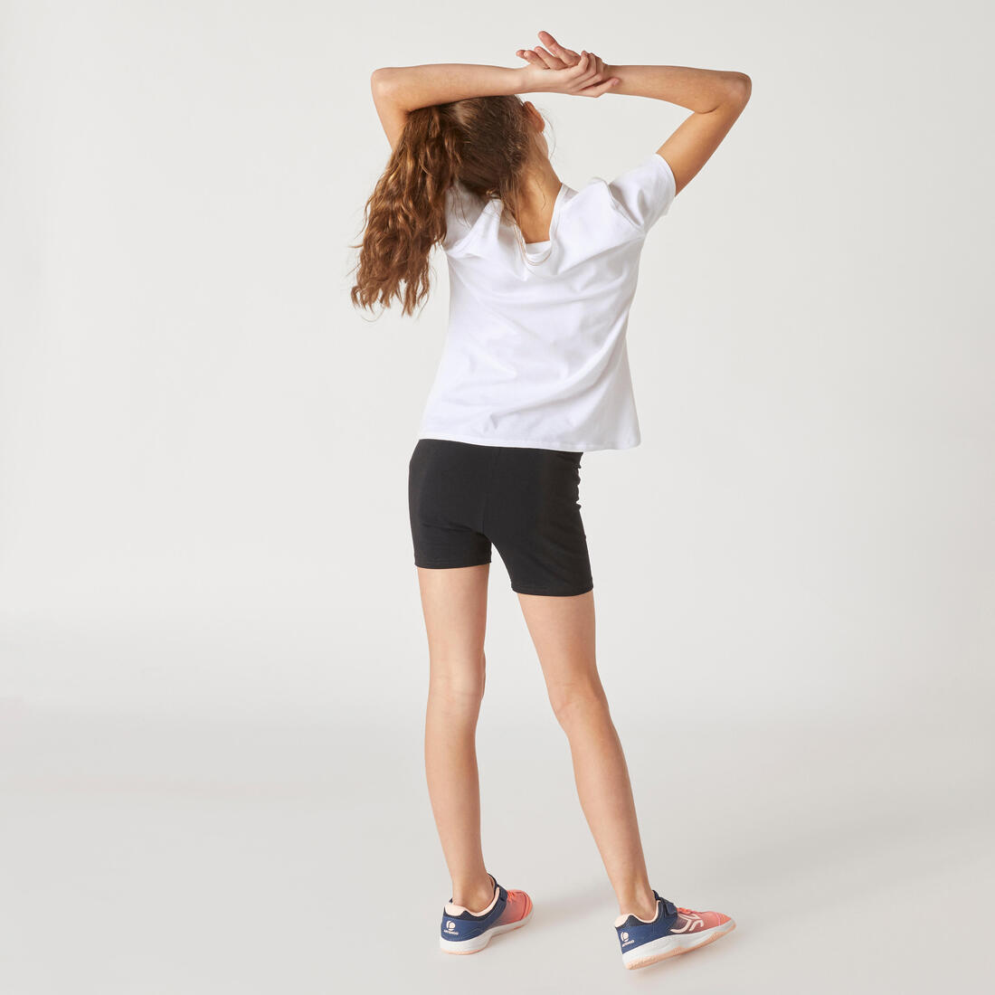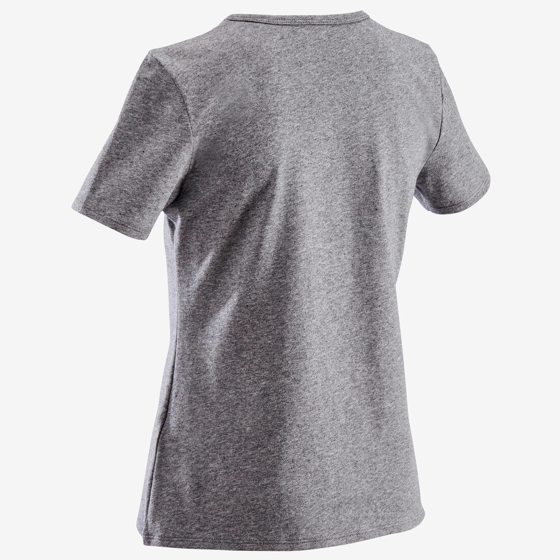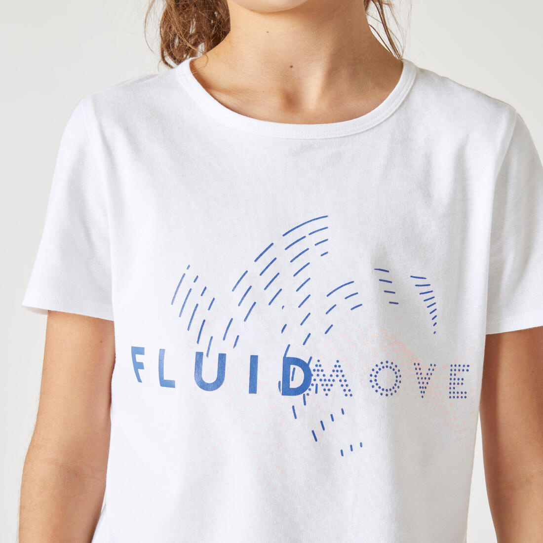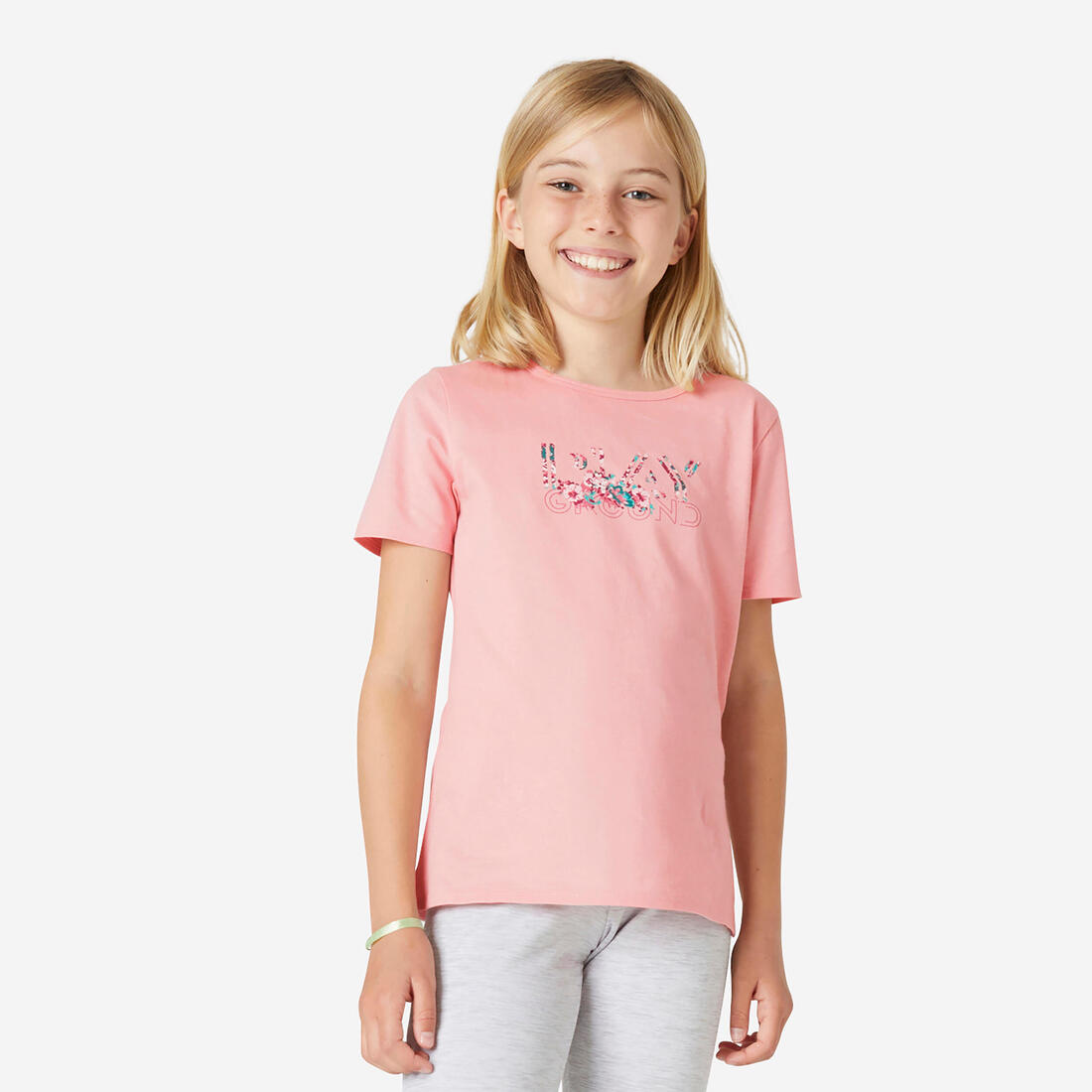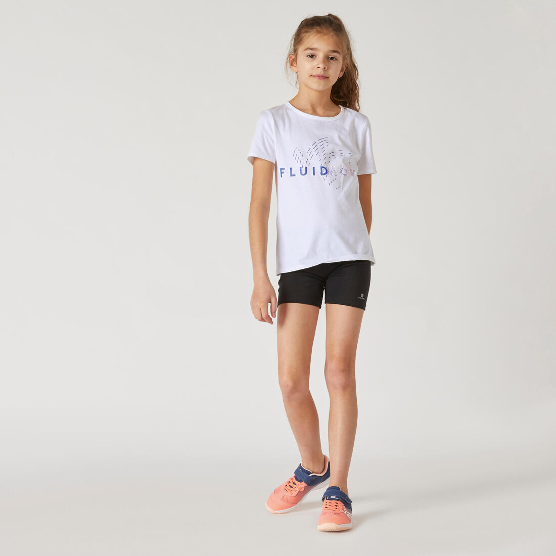 Notre mannequin porte le t-shirt manche courte 100 en taille 10-11 ans, elle mesure 1m43.