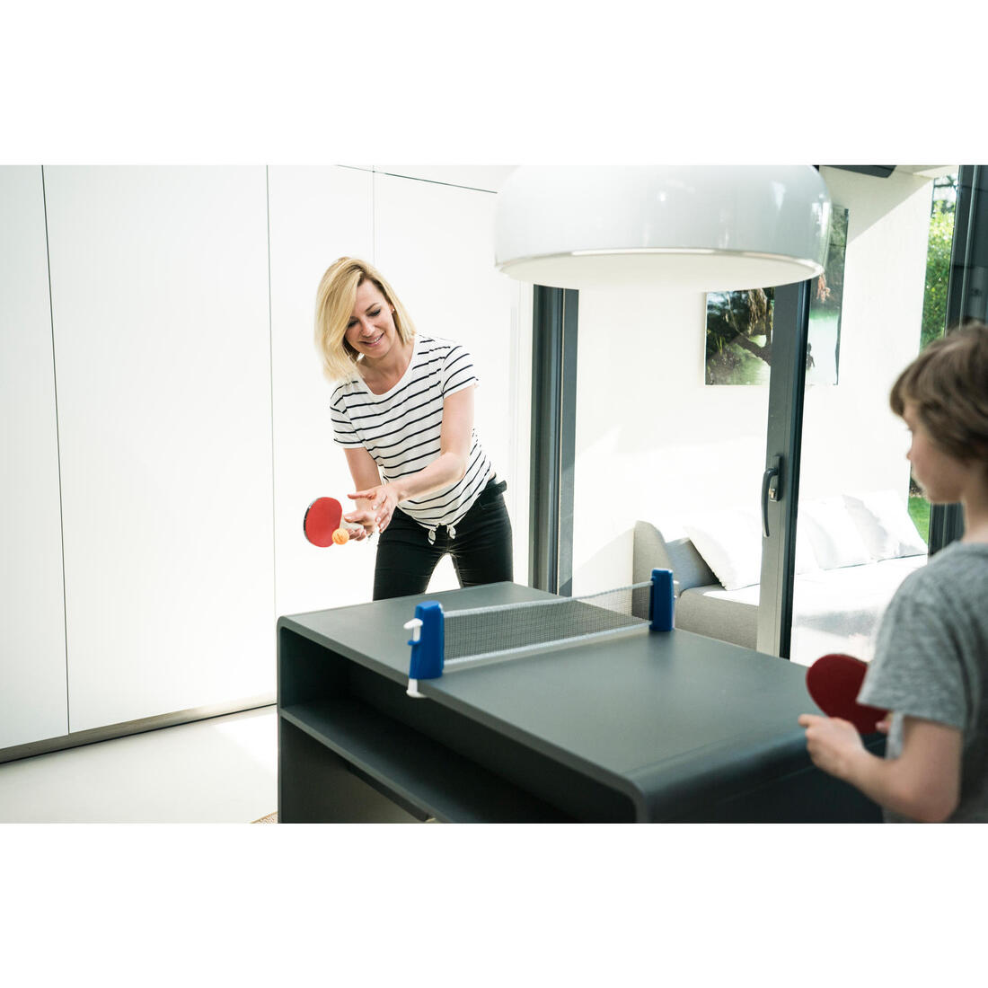 Installez notre filet en moins de 10 sec sur la plupart des tables salle à manger ou de salon, jusqu'à 90 cm de large et 5 cm d'épaisseur. Avec ses 2 petites raquettes et 2 balles, jouez partout !