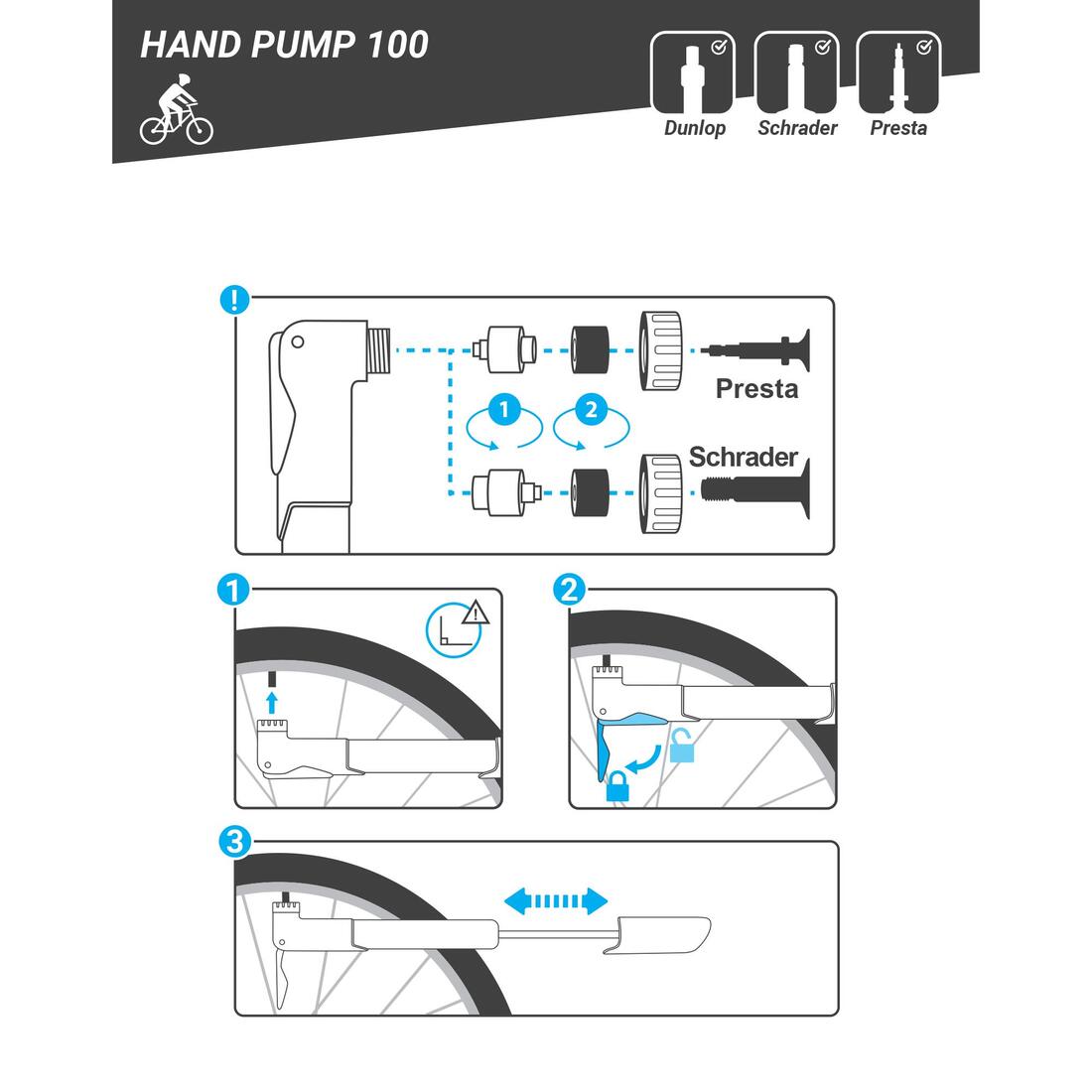 1) Sélectionner la connexion qui correspond à votre valve de chambre à air (inversion d'une pièce dans la tête de gonflage, voir schéma dans les photos produit). 2) Engager la tête de la pompe sur la valve. 3) Clipser à l'aide du levier gris la pompe sur la valve. 4) Gonfler jusqu'à obtention de la pression souhaitée.