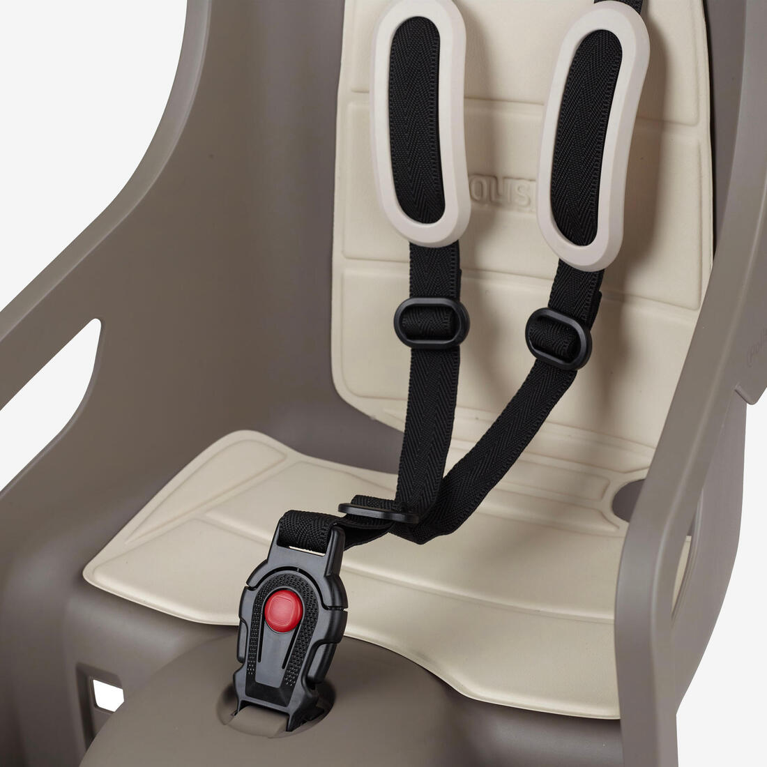 Accoudoir conçu pour le confort et la protection des mains de l'enfant. Ceinture de siège réglable à 3 points. Ceinture de siège à fixer au cadre. Autocollant réfléchissant à l'arrière. Conforme à la norme TÜV GS - EN14344:2022.