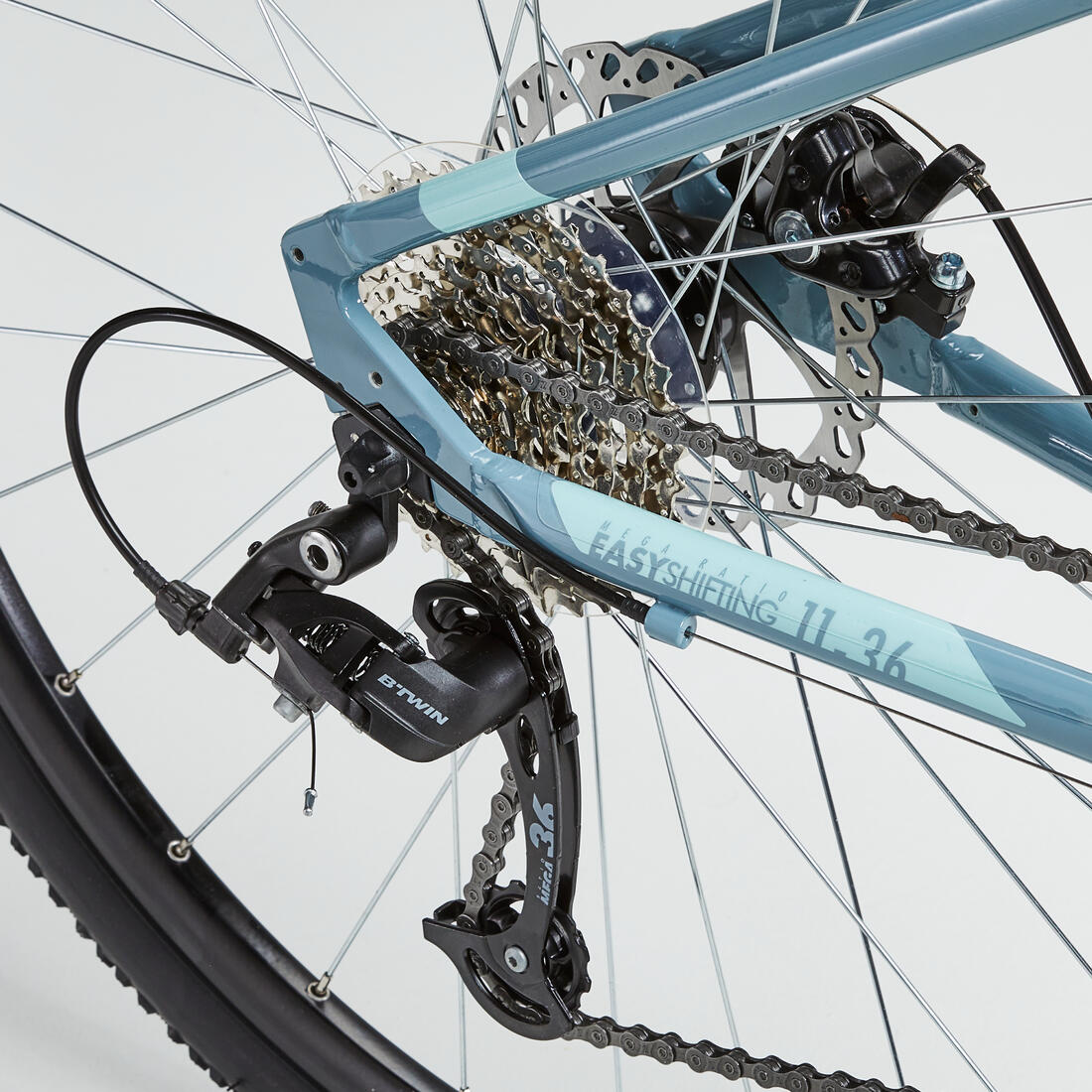 La transmission mono-plateau vous facile la vie : Vous changez les vitesses avec une seule gâchette. L'étagement des vitesses est prévu pour permettre le franchissement de petites côtes. - Sélecteur de vitesse à gâchette BTWIN SL569 - Cassette 9 vitesses MICROSHIFT H092. - Pignons : 11/ 36. - Monoplateau : 36 dents. - Chaîne KMC X9 avec attache rapide. - Dérailleur arrière : BTWIN RD M46-L. - Bague anti-déraillement.