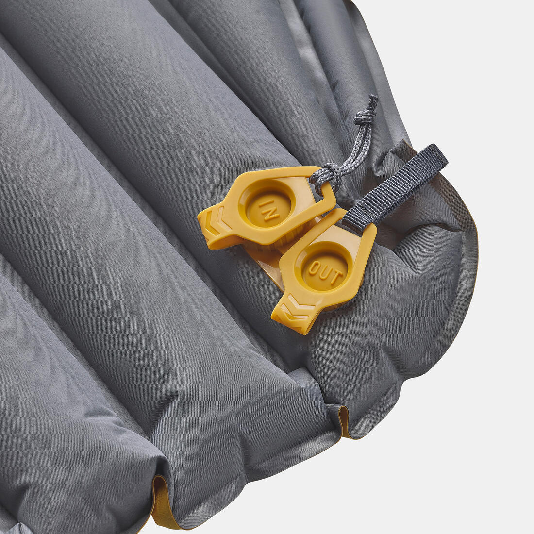 Une fois allongé, pensez à ajuster la pression de gonflage du matelas en appuyant légèrement sur la valve IN (capuchon ouvert). Un matelas trop dur est souvent synonyme d'inconfort. Des patchs silicone présents sur le dessus du matelas sont destinés à réduire le glissement de votre sac de couchage sur le matelas.