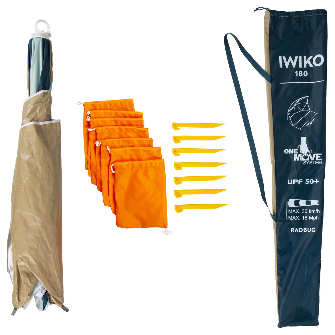 Poids : 1,5 kg Hauteur : 110 cm, Largeur : 180 cm, Profondeur : 80 cm. L'abri solaire de plage IWIKO se range dans sa housse de parasol (fournie). Dimensions de la housse (vite) : 112x24 cm. Dimensions de la housse (abri à l'intérieur) : 104 x 15 x 15 cm. Cette tente de plage permet d'abriter jusqu'à 3 adultes.