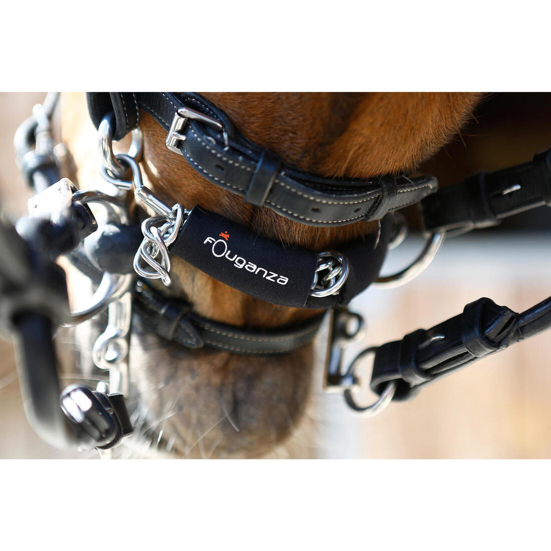 Le néoprène répartit les pressions de la gourmette sur le menton du cheval.