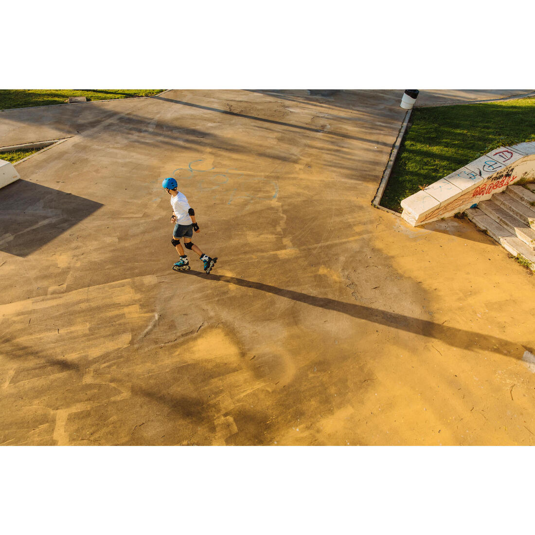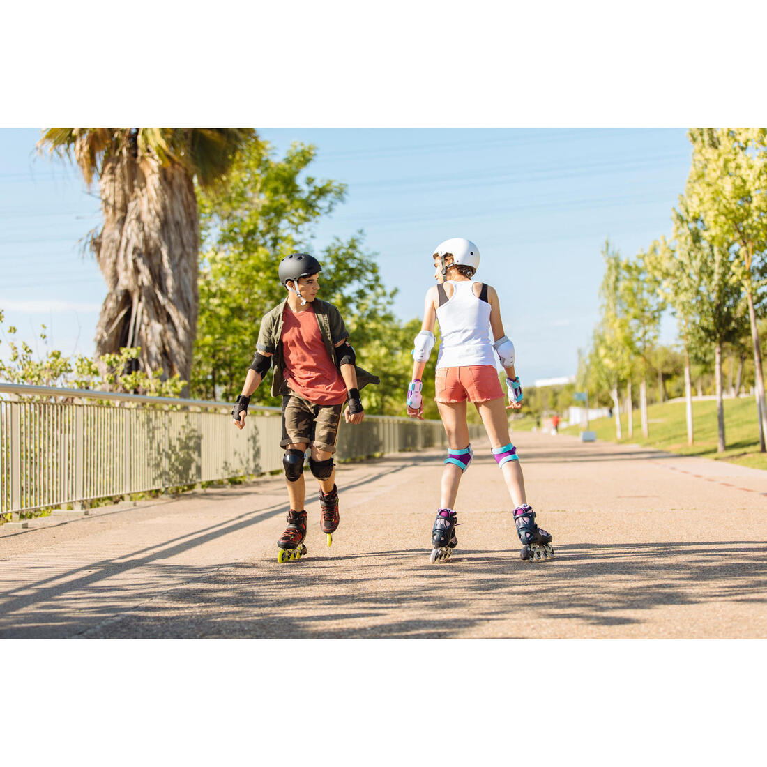 Contrairement au plastique qui "ripe" mais ne freine pas, la gomme présente une bonne adhérence : elle vous permet de patiner sans glisser lors des poussées, et de freiner efficacement. En plus, la gomme s’use moins vite que le plastique. Nos équipes Oxelo s'engagent pour la sécurité - et ce quel que soit votre niveau technique. Nous avons donc fait le choix d'équiper tous les rollers de roues et freins en gomme et non en PVC.