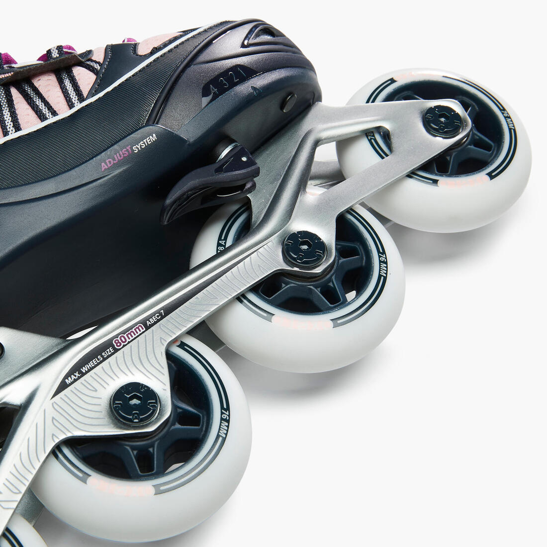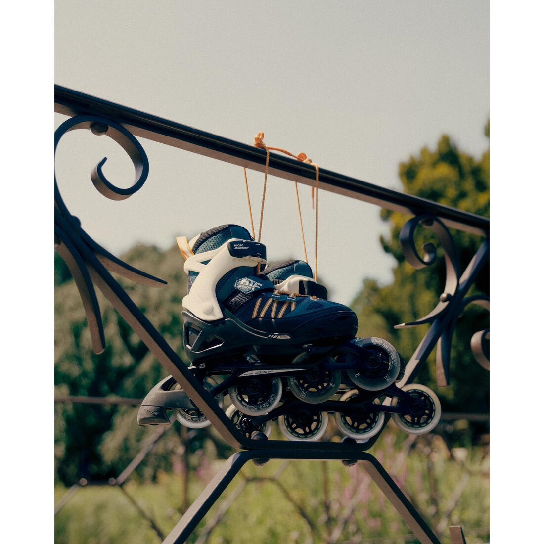 La platine du Roller Fit 5, c'est le coup de cœur d'Ewa, notre cheffe de produit. Les platines en aluminium apportent plus de rendement. Les grandes roues, de 76 mm et compatibles jusqu'à 80 mm en tailles 35 à 41, associées aux roulements ABEC 7 vous offrent plus de glisse et plus de vitesse. Pour freiner, nos rollers sont équipés d'un frein classique en tampon gomme que vous pouvez installer au pied droit ou gauche. Des tampons de rechange sont disponibles en magasin.
