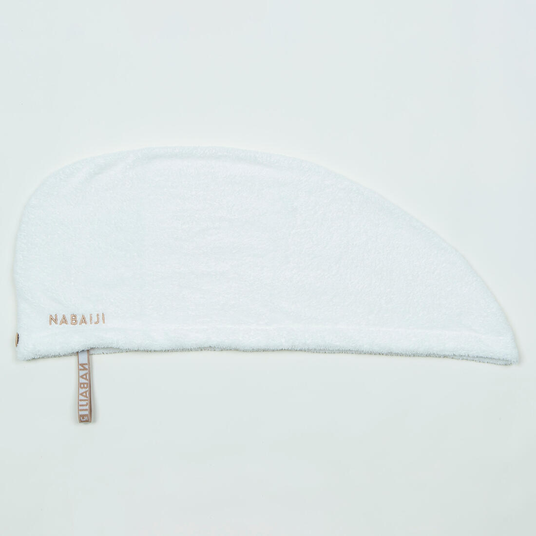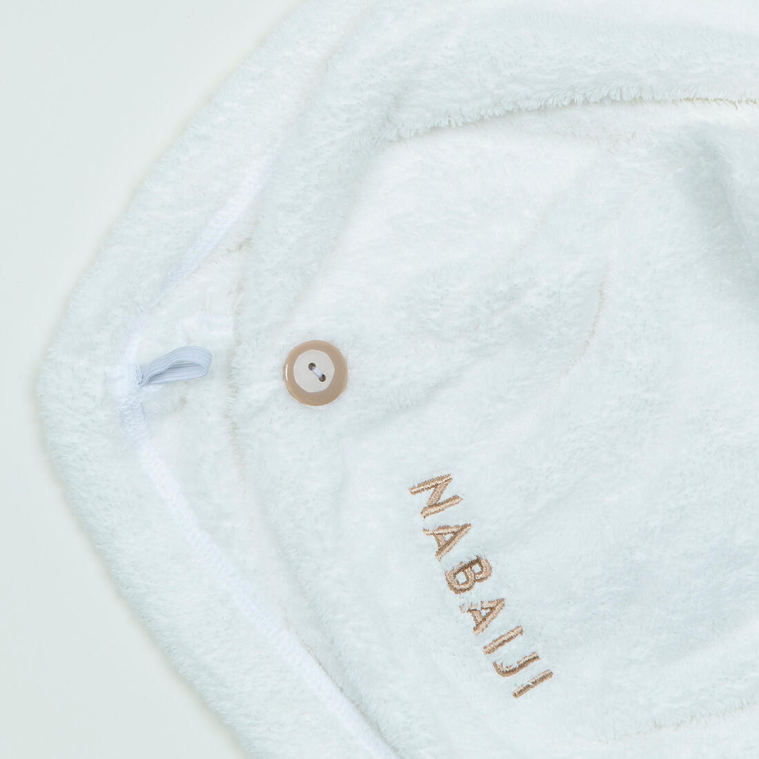 Envie de porter une attention particulière à vos cheveux ? La forme de cette serviette de bain enveloppe votre chevelure et reste bien en place sur votre tête grâce à un bouton.