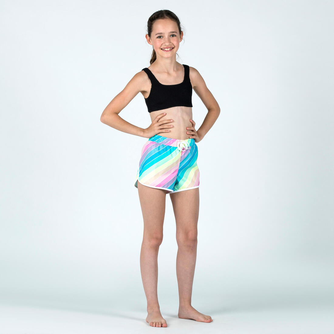 Ce short de bain fille se porte par dessus la culotte du maillot de bain pour rester bien couverte et à l'aise dans la pratique des sports d'eau. Ceinture élastiquée.
