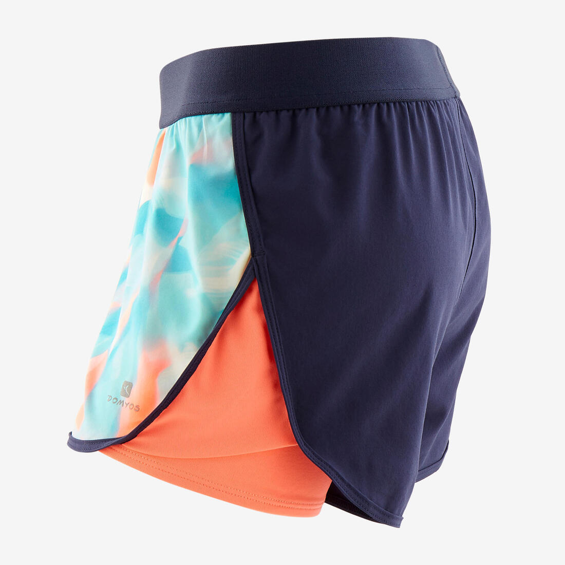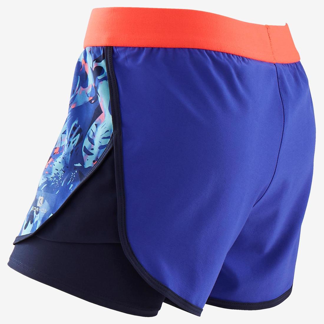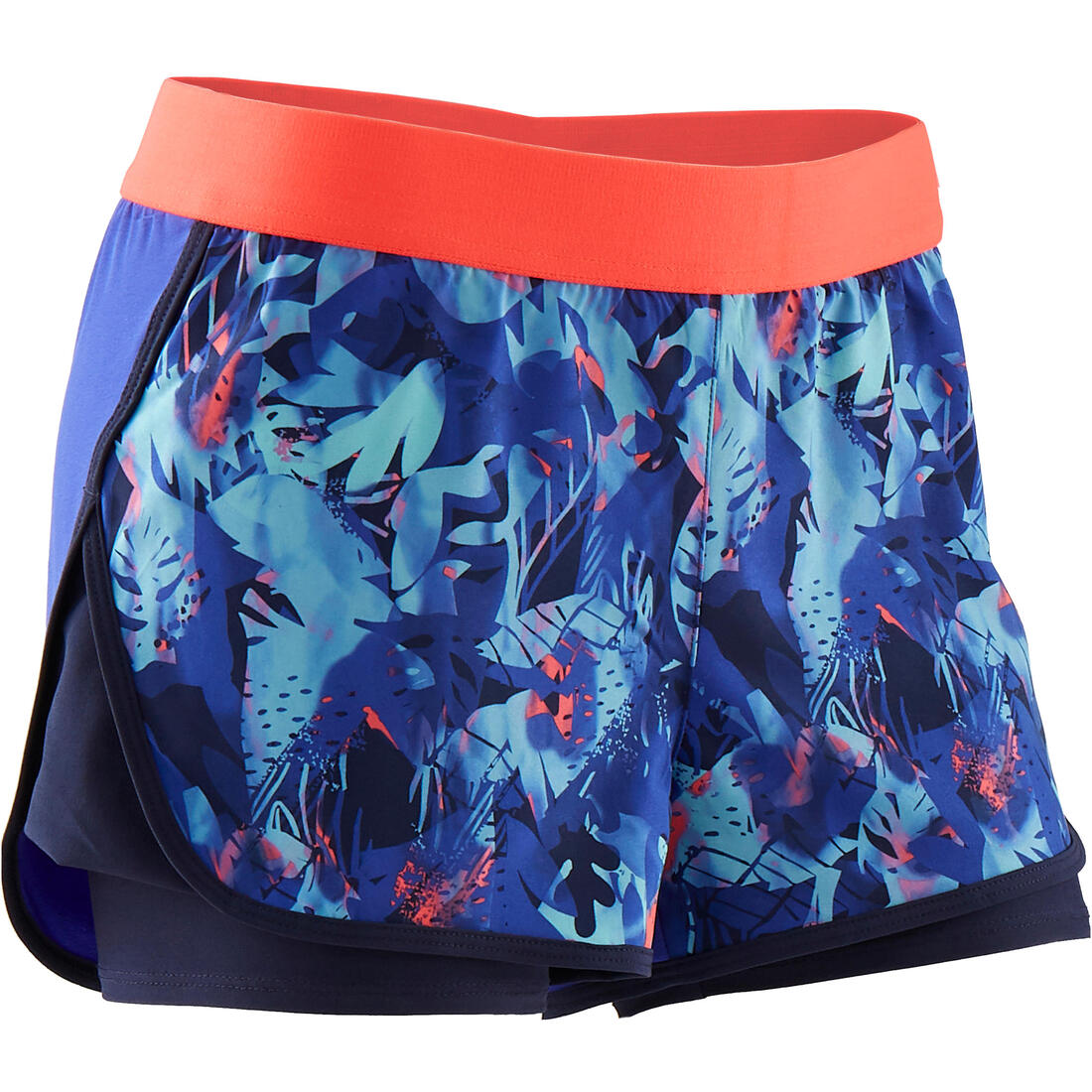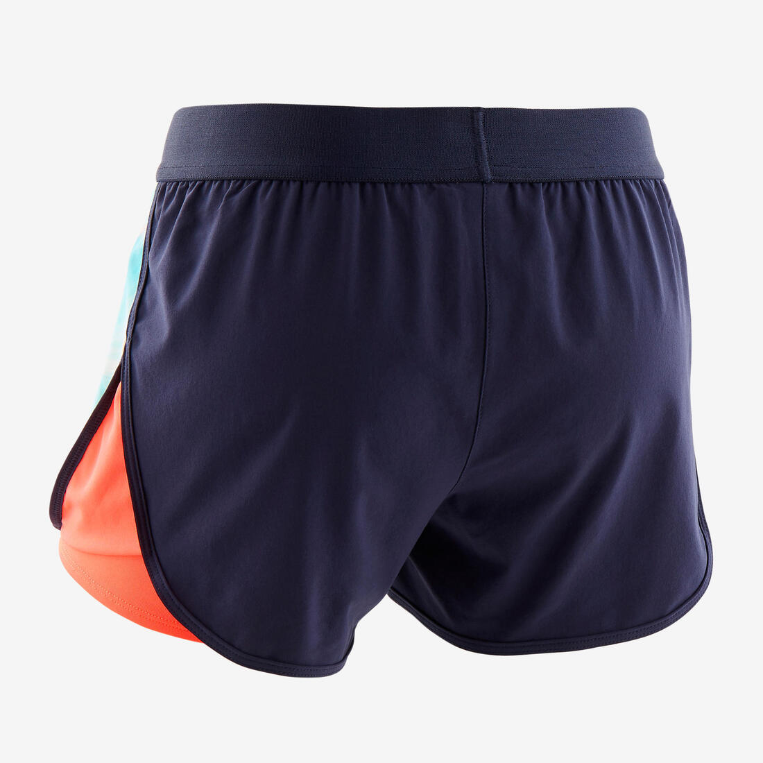 Short 2 en 1 multisport respirant fille, imprimé bleu et corail
